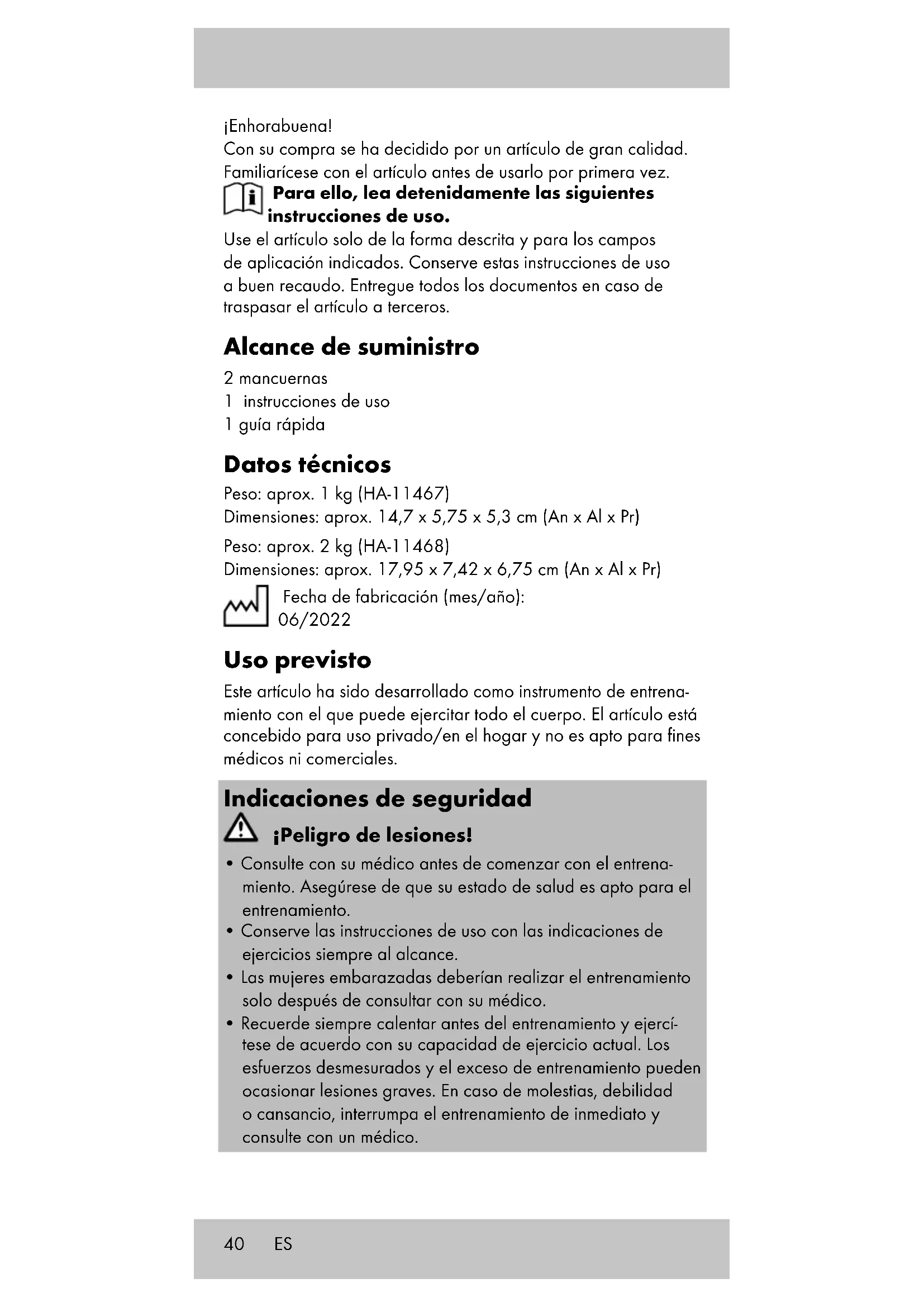 Importante: Asegúrese de que los muslos permanez- can paralelos y juntos. Empuje la pelvis hacia delan- te, el torso se mantiene erguido. ES43 Almacenamiento, limpieza Si no va a utilizarlo, almacene siempre el artículo seco y limpio y a temperatura ambiente. Limpie solo con un paño de limpieza húmedo y después seque frotándolo. ¡IMPORTANTE! No lo limpie con productos de limpieza agresivos. Indicaciones para la eliminación Elimine el artículo y el material de embalaje conforme a la normativa legal local en la actualidad. No deje material de embalaje, como bolsas de plástico, en manos de niños. Guarde el material de embalaje en un lugar inaccesible para éstos. Deseche los productos y embalajes de manera respetuo- sa con el medio ambiente. El código de reciclaje sirve para identificar diversos materiales para reincorporarlos en el ciclo de reciclaje. El código consta del símbolo de reciclaje, el cual debe reflejar el ciclo de recuperación, y de un número que identifica el material. Indicaciones relativas a la garantía y la gestión de servicios El artículo ha sido fabricado con gran esmero y sometido a controles constantes. Para el mismo, DELTA-SPORT HANDELS- KONTOR GmbH ofrece a los clientes finales particulares una garantía de tres años a contar desde la fecha de compra (perio- do de garantía) con arreglo a las condiciones que se exponen a continuación. La garantía tiene validez únicamente para fallos del material y fabricación. La garantía no cubre las piezas sometidas a un desgaste normal, las cuales se consideran piezas de desgaste (p. ej., pilas) así como tampoco piezas frágiles como, p. ej., interruptores, baterías o piezas fabricadas en vidrio o cristal. Se excluyen derechos derivados de esta garantía, si se ha realizado un uso incorrecto o abusivo del artículo o que no se encuentre dentro del marco del uso o ámbito de uso previstos o si no se ha observado lo recogido en el manual de instrucciones, a no ser que el cliente final demuestre que existen fallos del material o fabricación no derivados de una de las circunstancias expuestas anteriormente. Las demandas derivadas de la garantía sólo podrán presentarse dentro del periodo de garantía exhibiendo el comprobante de compra original. Le rogamos, por ello, que conserve el compro- bante de compra original. El periodo de garantía no se verá pro- longado por ningún tipo de reparación realizada con motivo de la garantía, la garantía legal o como gesto de buena voluntad. Esto se aplica también a las piezas sustituidas o reparadas. ES44 Por favor, dirija sus quejas primero a la línea telefónica del servicio de atención al cliente que se indica a continuación o póngase en contacto con nosotros por correo electrónico. Si el caso está cubierto por la garantía, a nuestra elección, reparare- mos o cambiaremos gratuitamente el artículo o le restituiremos el precio de compra del mismo. De la garantía no se derivan otros derechos. Esta garantía no limitará sus derechos legales, especialmente los derechos de garantía frente al vendedor correspondiente. IAN: 391390_2201 Servicio España Tel.: 900 984 989 E-Mail: deltasport@lidl.es ES45 Hjertelig tillykke! Du har valgt at købe et kvalitetsprodukt. Lær produktet at kende, inden du bruger det første gang. Det gør du ved at læse nedenstående brugervej- ledning omhyggeligt. Brug kun produktet som beskrevet og til de angivne anvendel- sesområder. Opbevar denne brugervejledning et sikkert sted. Udlever også alle dokumenter, hvis produktet videregives til en tredjepart. Leveringsomfang 2 x kort håndvægt 1 x brugervejledning 1 x kort vejledning Tekniske data Vægt: ca. 1 kg (HA-11467) Mål: ca. 14,7 x 5,75 x 5,3 cm (b x h x d) Vægt: ca. 2 kg (HA-11468) Mål: ca. 17,95 x 7,42 x 6,75 cm (b x h x d) Fremstillingsdato (måned/år): 06/2022 Bestemmelsesmæssig brug Denne artikel er udviklet til at være en træningsartikel, der kan anvendes til træning af hele kroppen. Artiklen er beregnet til privat brug/anvendelse i hjemmet og er ikke egnet til medicinske og erhvervsmæssige formål. Sikkerhedsanvisninger Fare for kvæstelser!