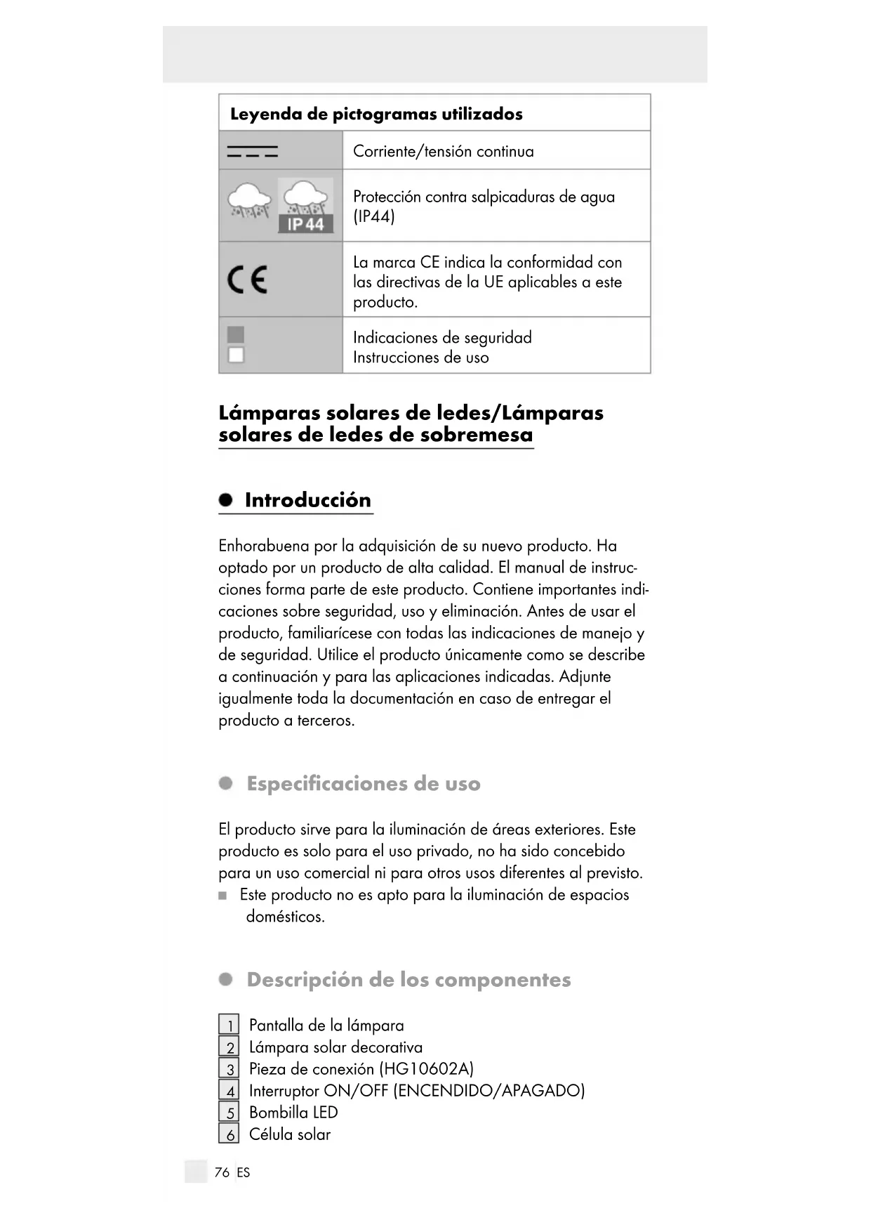 PARA FUTURAS CONSULTAS! Este producto puede ser utilizado por niños mayores de 8 años, así como por personas con capacidades físicas, sensoriales o mentales reducidas o que cuenten con poca experiencia y falta de conocimientos, siempre y cuando se les haya enseñado cómo utilizar el producto de forma se- gura y hayan comprendido los peligros que pueden resultar de un mal uso del mismo. No deje que los niños jueguen con el producto. Las labores de limpieza y mantenimiento no pueden ser efectuadas por niños sin la supervisión de un adulto. Nunca utilice el producto si detecta algún tipo de daño. La bombilla no es reemplazable. Si la bombilla falla al final de su vida útil, deberá reemplazar todo el producto.78 ES Indicaciones de seguridad específicas del producto Procure que la célula solar no se ensucie o se cubra de nieve y hielo en invierno. Esto disminuye la potencia de la célula solar. Indicaciones de seguridad sobre las pilas/baterías ¡PELIGRO DE MUERTE! Mantenga las pilas/baterías fuera del alcance de los niños. ¡En caso de ingestión, acuda inmediatamente a un médico! La ingestión puede provocar quemaduras, perforaciones de tejidos blandos y la muerte. Las quemaduras graves pueden aparecer pasadas 2 horas tras la ingestión. ¡PELIGRO DE EXPLOSIÓN! No recargue nunca pilas no recargables. No ponga las pilas/ baterías en cortocircuito ni tampoco las abra. Es- tas podrían recalentarse, explotar o provocar un incendio. Nunca arroje pilas/baterías al fuego o al agua. No aplique cargas mecánicas sobre las pilas/baterías. Riesgo de sulfatación de las pilas/baterías Evite condiciones y temperaturas extremas que puedan influir en el funcionamiento de las pilas/baterías, por ejemplo, acercarlas a un radiador o exponerlas directamente a la luz solar. ¡Si las pilas/baterías se sulfatan, evite el contacto de la piel, los ojos y las mucosas con los productos químicos! ¡En caso de entrar en contacto con el ácido, lave inmedia- tamente la zona afectada con abundante agua y busque atención médica! ¡UTILICE GUANTES DE SEGURIDAD! Las pilas/baterías sulfatadas o dañadas pueden provocar abrasiones al entrar en contacto con la piel. Por tanto, es imprescindible el uso de guantes de protección en estos casos. En caso de sulfatación de las pilas/baterías, retírelas inme- diatamente del producto para evitar daños. Retire las pilas/baterías del producto si no va a utilizarlo durante un período de tiempo prolongado.79 ES Riesgo de daño del producto ¡Utilice exclusivamente el tipo de pila/batería indicado! Introduzca las pilas/baterías teniendo en cuenta la polari- dad marcada con (+) y (-) tanto en las pilas/baterías como en el producto. ¡Limpie los contactos de la pila/batería y en el comparti- mento de las pilas antes de la inserción con un paño seco y libre de pelusas o un bastoncillo de algodón! Retire inmediatamente las pilas/baterías agotadas del producto. Funcionamiento La célula solar del producto transforma la luz solar en energía eléctrica y la guarda en la batería Ni-MH. Encienda el producto con el interruptor ON/OFF (encendido/apagado)
