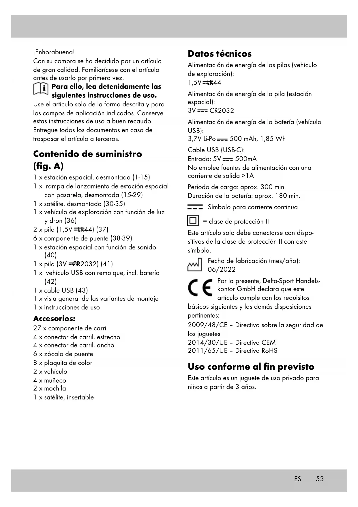 CR2032 Alimentación de energía de la batería (vehículo USB): 3,7V Li-Po 500 mAh, 1,85 Wh Cable USB (USB-C): Entrada: 5V 500mA No emplee fuentes de alimentación con una corriente de salida >1A Periodo de carga: aprox. 300 min. Duración de la batería: aprox. 180 min. Símbolo para corriente continua = clase de protección II Este artículo solo debe conectarse con dispo- sitivos de la clase de protección II con este símbolo. Fecha de fabricación (mes/año): 06/2022 Por la presente, Delta-Sport Handels- kontor GmbH declara que este artículo cumple con los requisitos básicos siguientes y las demás disposiciones pertinentes: 2009/48/CE – Directiva sobre la seguridad de los juguetes 2014/30/UE – Directiva CEM 2011/65/UE – Directiva RoHS Uso conforme al fin previsto Este artículo es un juguete de uso privado para niños a partir de 3 años.54 Indicaciones de seguridad