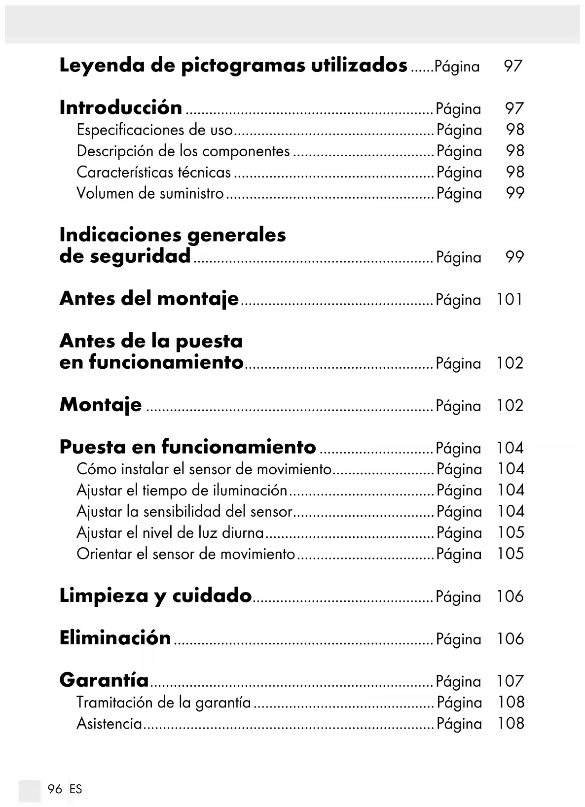 reacciones a movimientos dentro del área de detección.106 ES Limpieza y cuidado Antes de la limpieza, retire el fusible o desconecte el interruptor automático en la caja de fusibles. Nunca sumerja el producto en agua u otros líquidos. De lo contra- rio el producto podría resultar dañado. Limpie el producto con un paño sin pelusas ligeramente humede- cido y un detergente suave. Tras la limpieza y antes de la siguiente puesta en funcionamiento, vuelva a insertar el fusible o vuelva a conectar el interruptor mag- netotérmico. Eliminación El embalaje está compuesto por materiales no contaminantes que pueden ser desechados en el centro de reciclaje local.
