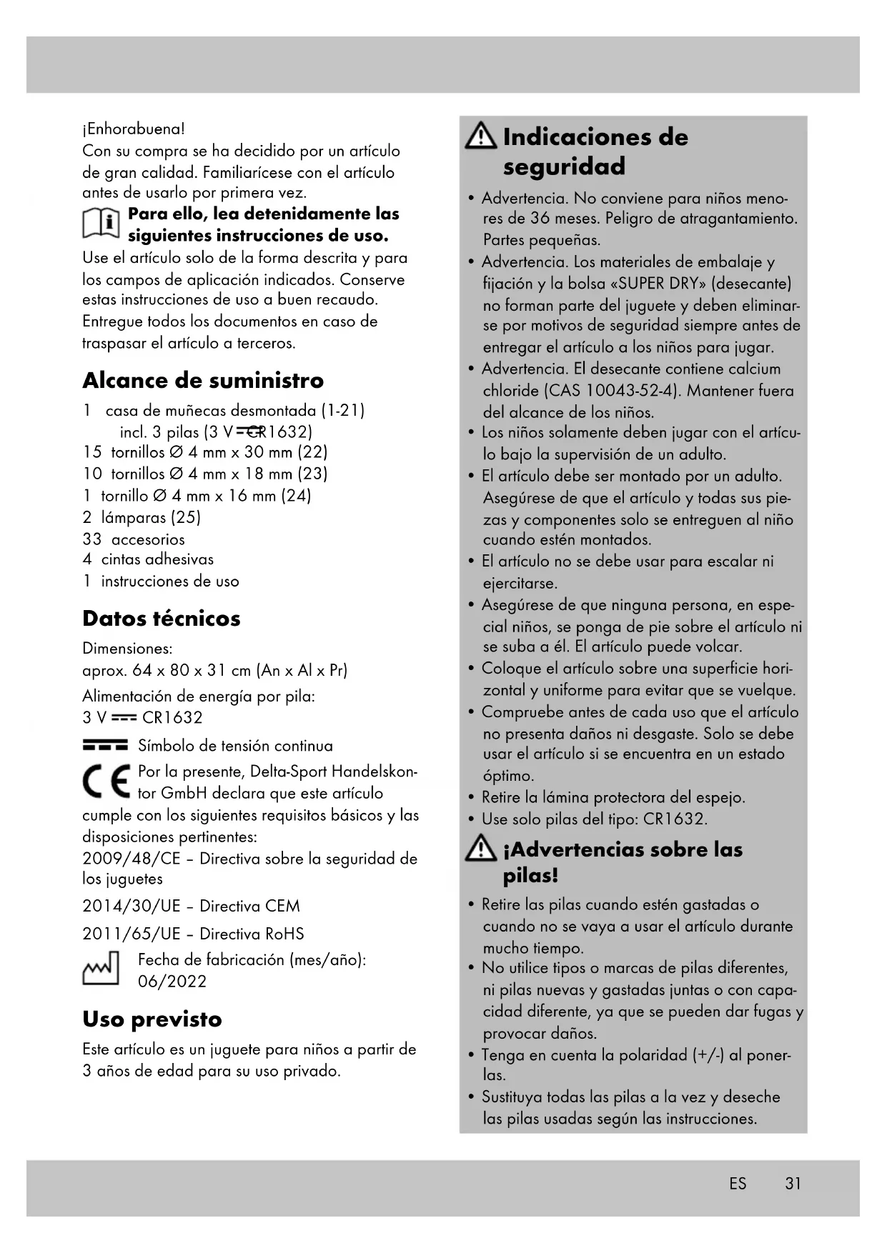 de la lámpara (25). Fije el timbre en la casa de muñecas. ES33 Almacenamiento, limpieza Si no va a utilizarlo, almacene siempre el artículo seco y limpio, sin pilas y a temperatura ambiente. Límpielo únicamente pasando un paño de limpieza seco. Lave los materiales textiles únicamente con agua fría y deje que se sequen a temperatura ambiente. ¡IMPORTANTE! No lo limpie con productos de limpieza agresivos. Indicaciones para la eliminación Cuando ya no se pueda volver a usar, no deseche el artículo con la basura doméstica, sino que, por el bien del medio ambiente, elimínelo de forma correcta. Puede informarse acerca de los centros de recogida y sus horarios de apertura en una administración competente. Las pilas/acumuladores se deben reciclar de conformidad con la directiva 2006/66/EG y sus enmiendas. Deseche las pilas/acumuladores o el artículo en las instalaciones de recogida disponibles. Los materiales de embalaje, como bolsas de plástico, no se deben dejar en manos de los niños. Conserve el material de embalaje fuera del alcance de los niños. Daños medioambientales por la eliminación incorrecta de pilas/ acumuladores. No deseche las pilas/ acumuladores con la basura doméstica. Pueden contener metales pesados y deben ser tratados como residuos especiales. Los símbolos químicos de los metales pesados son estos: Cd = cadmio, Hg = mercurio, Pb = plomo. Por ello, elimine las pilas/acumuladores en un punto de recogida comunitario. Deseche el artículo y el embalaje de manera respetuosa con el medio ambiente. Al separar los residuos, tenga en cuenta la marcación de los materiales de embalaje, que se indica con abreviatu- ras (a) y números (b) que significan lo siguiente: 1-7: plásticos/20-22: papel y cartón/ 80-98: materiales compuestos. El artículo y su material de embalaje son reci- clables, deséchelos separados para un mejor tratamiento de los residuos. El logo «Triman» solo se aplica en Francia. Para más información sobre la eliminación del artículo, acuda a su ayuntamiento o a las autoridades municipales. Indicaciones relativas a la garantía y la gestión de servicios El artículo ha sido fabricado con gran esmero y sometido a controles constantes. Para el mismo, DELTA-SPORT HANDELSKONTOR GmbH ofrece a los clientes finales particulares una garantía de tres años a contar desde la fecha de compra (periodo de garantía) con arreglo a las condiciones que se exponen a continuación. La garantía tiene validez únicamente para fallos del material y fabricación. La garantía no cubre las piezas sometidas a un desgaste normal, las cuales se consideran piezas de desgaste (p. ej., pilas) así como tampoco piezas frágiles como, p. ej., interruptores, baterías o piezas fabricadas en vidrio o cristal. Se excluyen derechos derivados de esta garantía, si se ha realizado un uso incorrecto o abusivo del artículo o que no se encuentre dentro del marco del uso o ámbito de uso previs- tos o si no se ha observado lo recogido en el manual de instrucciones, a no ser que el cliente final demuestre que existen fallos del material o fabricación no derivados de una de las circuns- tancias expuestas anteriormente. Las demandas derivadas de la garantía sólo podrán presentarse dentro del periodo de garantía exhibiendo el comprobante de compra original. Le rogamos, por ello, que conserve el comprobante de compra original. El periodo de garantía no se verá prolongado por ningún tipo de reparación realizada con motivo de la ga- rantía, la garantía legal o como gesto de buena voluntad. Esto se aplica también a las piezas sustituidas o reparadas. ES34 Por favor, dirija sus quejas primero a la línea telefónica del servicio de atención al cliente que se indica a continuación o póngase en contacto con nosotros por correo electrónico. Si el caso está cubierto por la garantía, a nuestra elección, repararemos o cambiaremos gratuitamente el artículo o le restituiremos el precio de compra del mismo. De la garantía no se derivan otros derechos. Esta garantía no limitará sus derechos legales, especialmente los derechos de garantía frente al vendedor correspondiente. IAN: 393053_2201 Servicio España Tel.: 900 984 989 E-Mail: deltasport@lidl.es ES35 Hjertelig tillykke! Du har valgt at købe et kvalitetsprodukt. Lær produktet at kende, inden du bruger det første gang. Det gør du ved at læse nedenstå- ende brugervejledning omhygge- ligt. Brug kun produktet som beskrevet og til de angivne anvendelsesområder. Opbevar denne brugervejledning et sikkert sted. Udlever også alle dokumenter, hvis produktet videregives til en tredjepart. Leveringsomfang 1 x dukkehus, adskilt (1-21) inkl. 3 x batteri (3 V CR1632) 15 x skrue Ø 4 mm x 30 mm (22) 10 x skrue Ø 4 mm x 18 mm (23) 1 x skrue Ø 4 mm x 16 mm (24) 2 x lyselement (25) 33 x tilbehør 4 x klæbebånd 1 x brugervejledning Tekniske data Mål: ca. 64 x 80 x 31 cm (b x h x d) Strømforsyning, batteri: 3 V CR1632 Symbol for jævnspænding Hermed erklærer Delta-Sport Handels- kontor GmbH, at denne artikel er i overensstemmelse med følgende grundlæggen- de krav og de øvrige gældende bestemmelser: 2009/48/EF – legetøjsdirektiv 2014/30/EU – EMC-direktiv 2011/65/EU – RoHS-direktiv Fremstillingsdato (måned/år): 06/2022 Bestemmelsesmæssig brug Denne artikel er legetøj beregnet til børn fra 3 år til privat brug. Sikkerhedsanvisninger