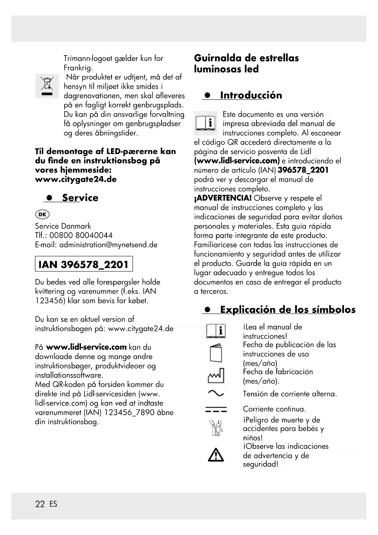 www.lidl-service.com kan du downloade denne og mange andre instruktionsbøger, produktvideoer og installationssoftware. Med QR-koden på forsiden kommer du direkte ind på Lidl-servicesiden (www. lidl-service.com) og kan ved at indtaste varenummeret (IAN) 123456_7890 åbne din instruktionsbog. Guirnalda de estrellas luminosas led z Introducción Este documento es una versión impresa abreviada del manual de instrucciones completo. Al escanear el código QR accederá directamente a la página de servicio posventa de Lidl (www.lidl-service.com) e introduciendo el número de artículo (IAN) 396578_2201 podrá ver y descargar el manual de instrucciones completo.