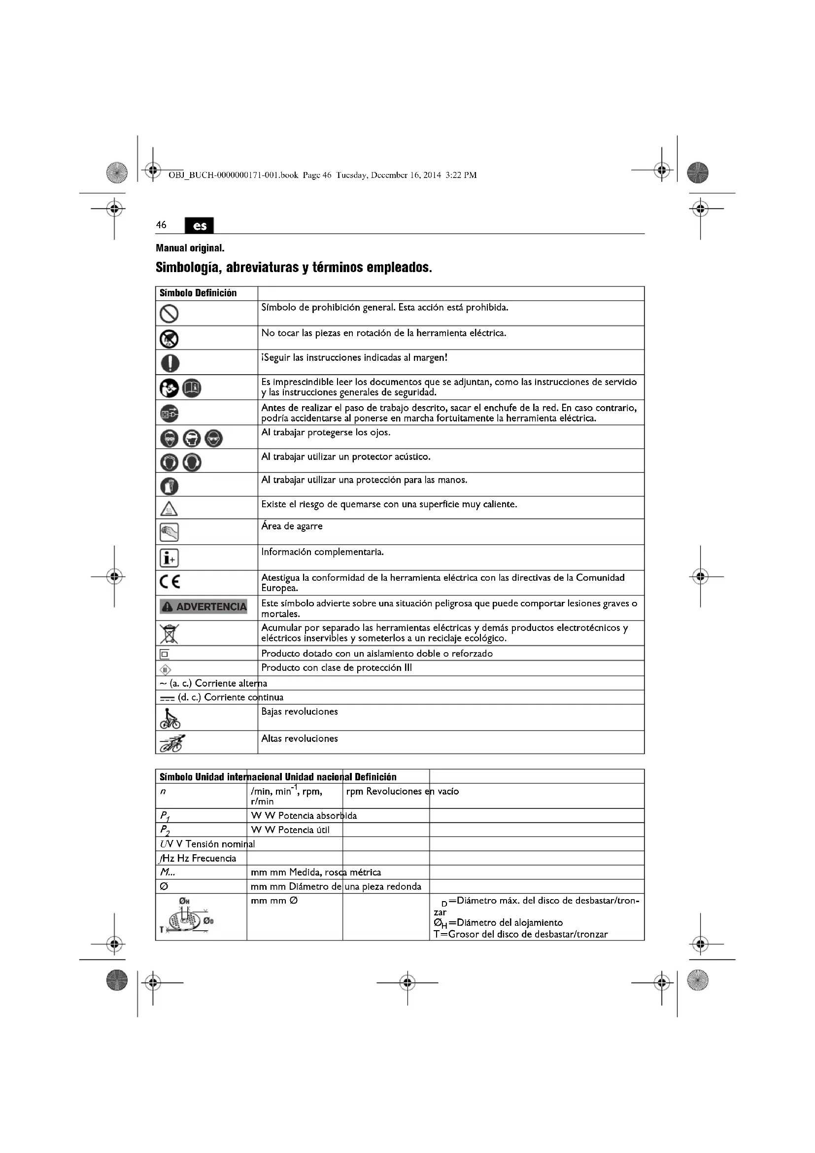 Manual original. Simbología, abreviaturas y términos empleados. Símbolo Definición Símbolo de prohibición general. Esta acción está prohibida. No tocar las piezas en rotación de la herramienta eléctrica. ¡Seguir las instrucciones indicadas al margen! Es imprescindible leer los documentos que se adjuntan, como las instrucciones de servicio y las instrucciones generales de seguridad. Antes de realizar el paso de trabajo descrito, sacar el enchufe de la red. En caso contrario, podría accidentarse al ponerse en marcha fortuitamente la herramienta eléctrica. Al trabajar protegerse los ojos. Al trabajar utilizar un protector acústico. Al trabajar utilizar una protección para las manos. Existe el riesgo de quemarse con una superficie muy caliente. Área de agarre Información complementaria. Atestigua la conformidad de la herramienta eléctrica con las directivas de la Comunidad Europea. Este símbolo advierte sobre una situación peligrosa que puede comportar lesiones graves o mortales. Acumular por separado las herramientas eléctricas y demás productos electrotécnicos y eléctricos inservibles y someterlos a un reciclaje ecológico. Producto dotado con un aislamiento doble o reforzado Producto con clase de protección III ~ (a. c.) Corriente alterna (d. c.) Corriente continua Bajas revoluciones Altas revoluciones ADVERTENCIA Símbolo Unidad internacional Unidad nacional Definición