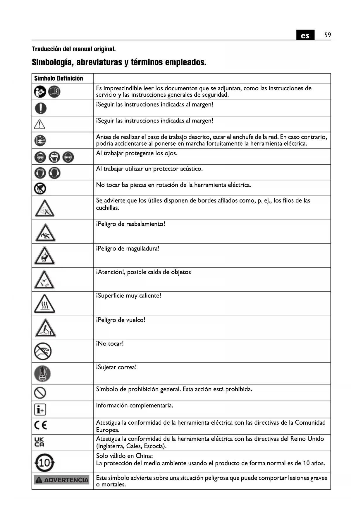 Traducción del manual original. Simbología, abreviaturas y términos empleados. Símbolo Definición Es imprescindible leer los documentos que se adjuntan, como las instrucciones de servicio y las instrucciones generales de seguridad. ¡Seguir las instrucciones indicadas al margen! ¡Seguir las instrucciones indicadas al margen! Antes de realizar el paso de trabajo descrito, sacar el enchufe de la red. En caso contrario, podría accidentarse al ponerse en marcha fortuitamente la herramienta eléctrica. Al trabajar protegerse los ojos. Al trabajar utilizar un protector acústico. No tocar las piezas en rotación de la herramienta eléctrica. Se advierte que los útiles disponen de bordes afilados como, p. ej., los filos de las cuchillas. ¡Peligro de resbalamiento! ¡Peligro de magulladura! ¡Atención!, posible caída de objetos ¡Superficie muy caliente! ¡Peligro de vuelco! ¡No tocar! ¡Sujetar correa! Símbolo de prohibición general. Esta acción está prohibida. Información complementaria. Atestigua la conformidad de la herramienta eléctrica con las directivas de la Comunidad Europea. Atestigua la conformidad de la herramienta eléctrica con las directivas del Reino Unido (Inglaterra, Gales, Escocia). Solo válido en China: La protección del medio ambiente usando el producto de forma normal es de 10 años. Este símbolo advierte sobre una situación peligrosa que puede comportar lesiones graves o mortales. ADVERTENCIA60