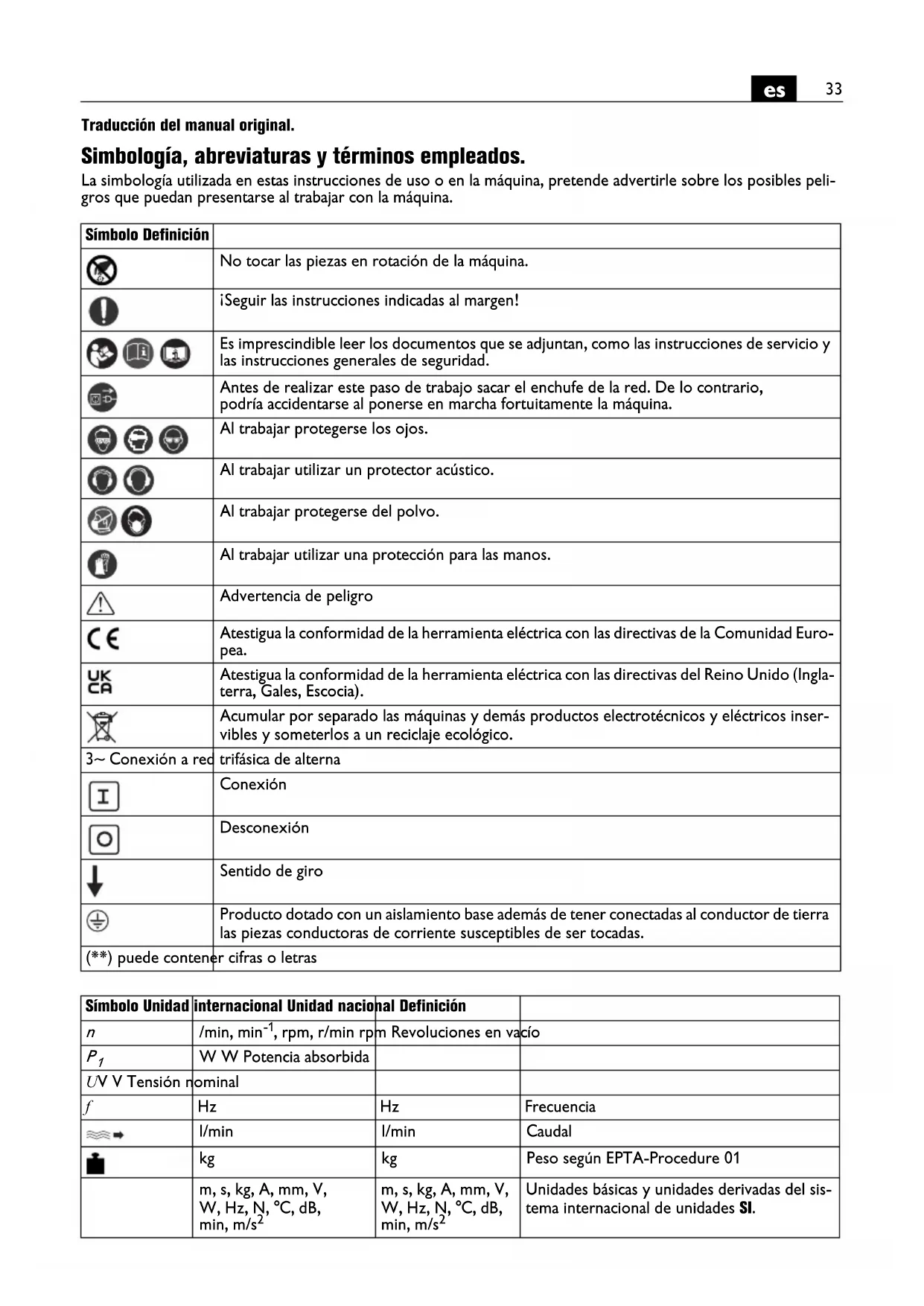 Traducción del manual original. Simbología, abreviaturas y términos empleados. La simbología utilizada en estas instrucciones de uso o en la máquina, pretende advertirle sobre los posibles peli- gros que puedan presentarse al trabajar con la máquina. Símbolo Definición No tocar las piezas en rotación de la máquina. ¡Seguir las instrucciones indicadas al margen! Es imprescindible leer los documentos que se adjuntan, como las instrucciones de servicio y las instrucciones generales de seguridad. Antes de realizar este paso de trabajo sacar el enchufe de la red. De lo contrario, podría accidentarse al ponerse en marcha fortuitamente la máquina. Al trabajar protegerse los ojos. Al trabajar utilizar un protector acústico. Al trabajar protegerse del polvo. Al trabajar utilizar una protección para las manos. Advertencia de peligro Atestigua la conformidad de la herramienta eléctrica con las directivas de la Comunidad Euro- pea. Atestigua la conformidad de la herramienta eléctrica con las directivas del Reino Unido (Ingla- terra, Gales, Escocia). Acumular por separado las máquinas y demás productos electrotécnicos y eléctricos inser- vibles y someterlos a un reciclaje ecológico. 3~ Conexión a red trifásica de alterna Conexión Desconexión Sentido de giro Producto dotado con un aislamiento base además de tener conectadas al conductor de tierra las piezas conductoras de corriente susceptibles de ser tocadas. (**) puede contener cifras o letras Símbolo Unidad internacional Unidad nacional Definición