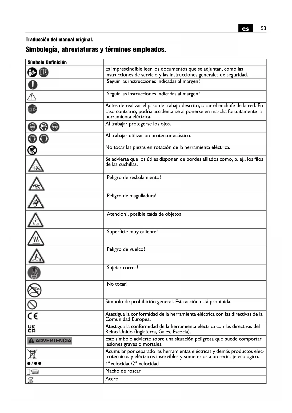 Traducción del manual original. Simbología, abreviaturas y términos empleados. Símbolo Definición Es imprescindible leer los documentos que se adjuntan, como las instrucciones de servicio y las instrucciones generales de seguridad. ¡Seguir las instrucciones indicadas al margen! ¡Seguir las instrucciones indicadas al margen! Antes de realizar el paso de trabajo descrito, sacar el enchufe de la red. En caso contrario, podría accidentarse al ponerse en marcha fortuitamente la herramienta eléctrica. Al trabajar protegerse los ojos. Al trabajar utilizar un protector acústico. No tocar las piezas en rotación de la herramienta eléctrica. Se advierte que los útiles disponen de bordes afilados como, p. ej., los filos de las cuchillas. ¡Peligro de resbalamiento! ¡Peligro de magulladura! ¡Atención!, posible caída de objetos ¡Superficie muy caliente! ¡Peligro de vuelco! ¡Sujetar correa! ¡No tocar! Símbolo de prohibición general. Esta acción está prohibida. Atestigua la conformidad de la herramienta eléctrica con las directivas de la Comunidad Europea. Atestigua la conformidad de la herramienta eléctrica con las directivas del Reino Unido (Inglaterra, Gales, Escocia). Este símbolo advierte sobre una situación peligrosa que puede comportar lesiones graves o mortales. Acumular por separado las herramientas eléctricas y demás productos elec- trotécnicos y eléctricos inservibles y someterlos a un reciclaje ecológico.
