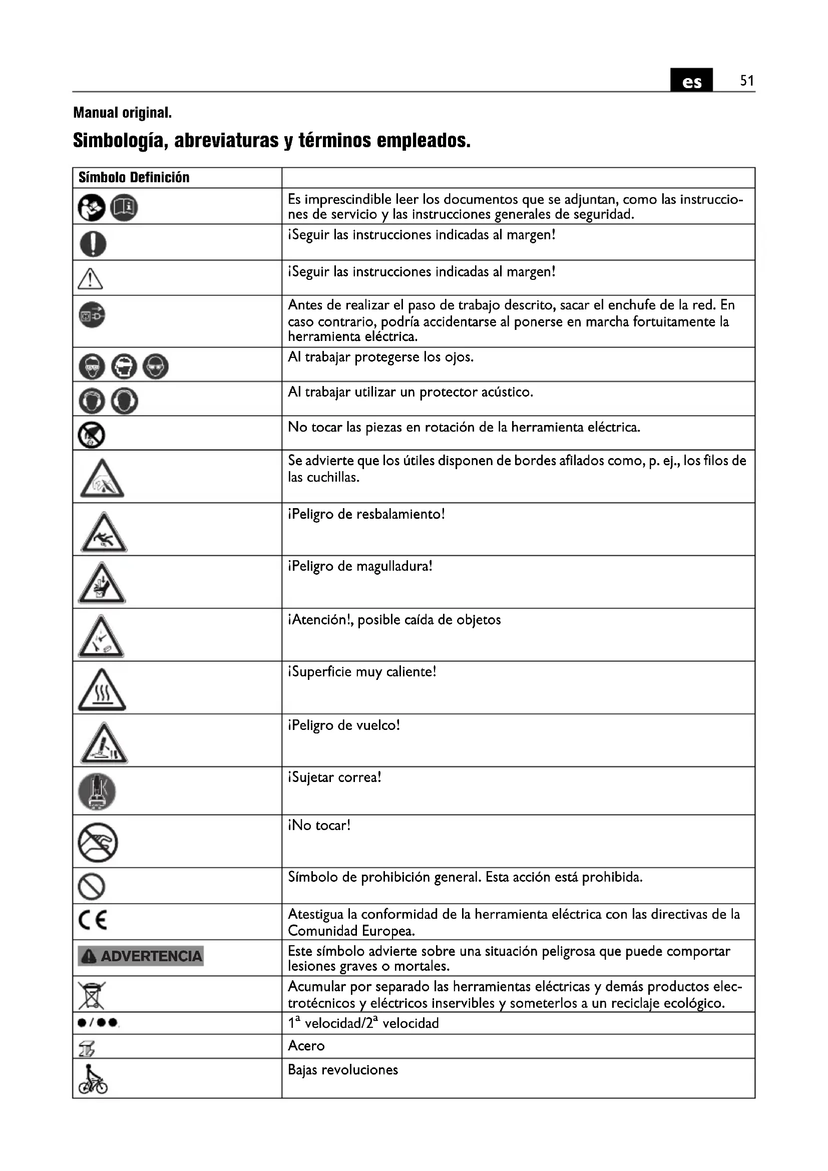 Manual original. Simbología, abreviaturas y términos empleados. Símbolo Definición Es imprescindible leer los documentos que se adjuntan, como las instruccio- nes de servicio y las instrucciones generales de seguridad. ¡Seguir las instrucciones indicadas al margen! ¡Seguir las instrucciones indicadas al margen! Antes de realizar el paso de trabajo descrito, sacar el enchufe de la red. En caso contrario, podría accidentarse al ponerse en marcha fortuitamente la herramienta eléctrica. Al trabajar protegerse los ojos. Al trabajar utilizar un protector acústico. No tocar las piezas en rotación de la herramienta eléctrica. Se advierte que los útiles disponen de bordes afilados como, p. ej., los filos de las cuchillas. ¡Peligro de resbalamiento! ¡Peligro de magulladura! ¡Atención!, posible caída de objetos ¡Superficie muy caliente! ¡Peligro de vuelco! ¡Sujetar correa! ¡No tocar! Símbolo de prohibición general. Esta acción está prohibida. Atestigua la conformidad de la herramienta eléctrica con las directivas de la Comunidad Europea. Este símbolo advierte sobre una situación peligrosa que puede comportar lesiones graves o mortales. Acumular por separado las herramientas eléctricas y demás productos elec- trotécnicos y eléctricos inservibles y someterlos a un reciclaje ecológico.