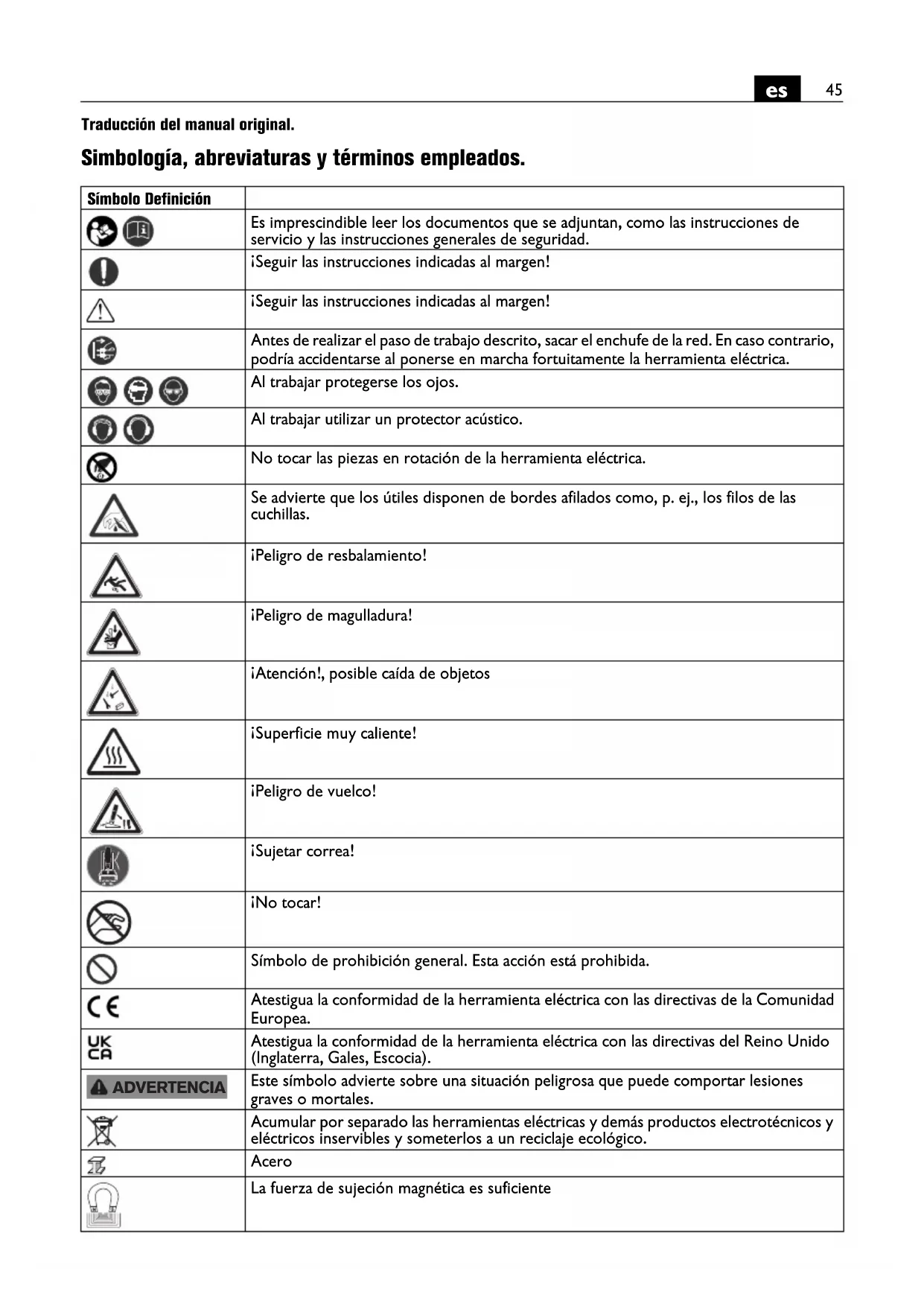 Traducción del manual original. Simbología, abreviaturas y términos empleados. Símbolo Definición Es imprescindible leer los documentos que se adjuntan, como las instrucciones de servicio y las instrucciones generales de seguridad. ¡Seguir las instrucciones indicadas al margen! ¡Seguir las instrucciones indicadas al margen! Antes de realizar el paso de trabajo descrito, sacar el enchufe de la red. En caso contrario, podría accidentarse al ponerse en marcha fortuitamente la herramienta eléctrica. Al trabajar protegerse los ojos. Al trabajar utilizar un protector acústico. No tocar las piezas en rotación de la herramienta eléctrica. Se advierte que los útiles disponen de bordes afilados como, p. ej., los filos de las cuchillas. ¡Peligro de resbalamiento! ¡Peligro de magulladura! ¡Atención!, posible caída de objetos ¡Superficie muy caliente! ¡Peligro de vuelco! ¡Sujetar correa! ¡No tocar! Símbolo de prohibición general. Esta acción está prohibida. Atestigua la conformidad de la herramienta eléctrica con las directivas de la Comunidad Europea. Atestigua la conformidad de la herramienta eléctrica con las directivas del Reino Unido (Inglaterra, Gales, Escocia). Este símbolo advierte sobre una situación peligrosa que puede comportar lesiones graves o mortales. Acumular por separado las herramientas eléctricas y demás productos electrotécnicos y eléctricos inservibles y someterlos a un reciclaje ecológico. Acero La fuerza de sujeción magnética es suficiente ADVERTENCIA46