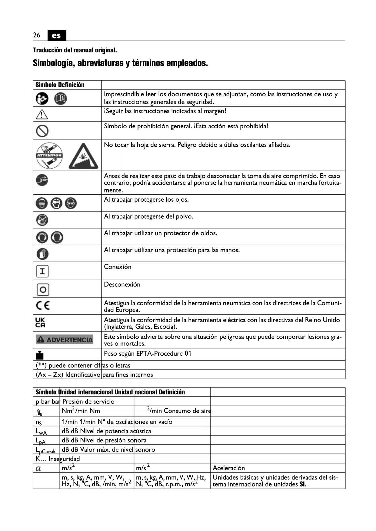 Traducción del manual original. Simbología, abreviaturas y términos empleados. Símbolo Definición Imprescindible leer los documentos que se adjuntan, como las instrucciones de uso y las instrucciones generales de seguridad. ¡Seguir las instrucciones indicadas al margen! Símbolo de prohibición general. ¡Esta acción está prohibida! No tocar la hoja de sierra. Peligro debido a útiles oscilantes afilados. Antes de realizar este paso de trabajo desconectar la toma de aire comprimido. En caso contrario, podría accidentarse al ponerse la herramienta neumática en marcha fortuita- mente. Al trabajar protegerse los ojos. Al trabajar protegerse del polvo. Al trabajar utilizar un protector de oídos. Al trabajar utilizar una protección para las manos. Conexión Desconexión Atestigua la conformidad de la herramienta neumática con las directrices de la Comuni- dad Europea. Atestigua la conformidad de la herramienta eléctrica con las directivas del Reino Unido (Inglaterra, Gales, Escocia). Este símbolo advierte sobre una situación peligrosa que puede comportar lesiones gra- ves o mortales. Peso según EPTA-Procedure 01 (**) puede contener cifras o letras (Ax – Zx) Identificativo para fines internos Símbolo Unidad internacional Unidad nacional Definición p bar bar Presión de servicio