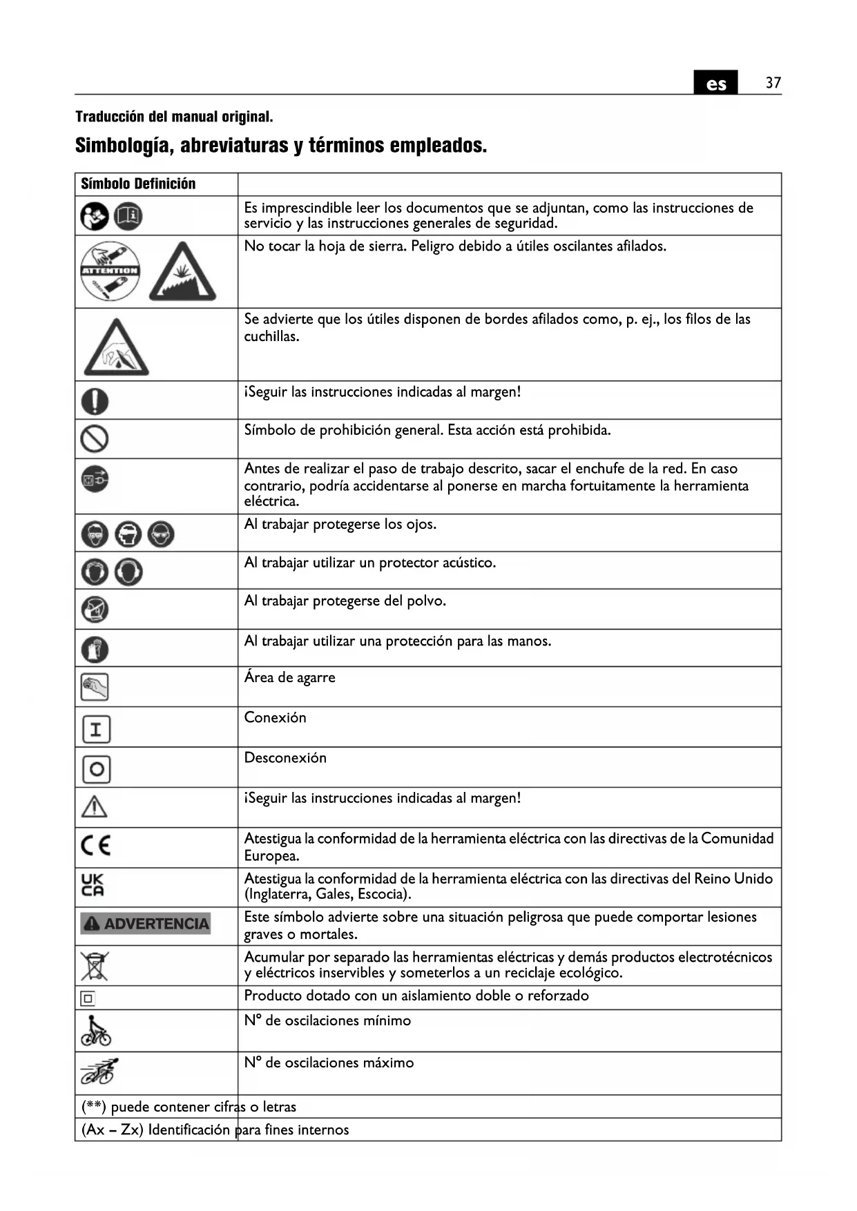 Traducción del manual original. Simbología, abreviaturas y términos empleados. Símbolo Definición Es imprescindible leer los documentos que se adjuntan, como las instrucciones de servicio y las instrucciones generales de seguridad. No tocar la hoja de sierra. Peligro debido a útiles oscilantes afilados. Se advierte que los útiles disponen de bordes afilados como, p. ej., los filos de las cuchillas. ¡Seguir las instrucciones indicadas al margen! Símbolo de prohibición general. Esta acción está prohibida. Antes de realizar el paso de trabajo descrito, sacar el enchufe de la red. En caso contrario, podría accidentarse al ponerse en marcha fortuitamente la herramienta eléctrica. Al trabajar protegerse los ojos. Al trabajar utilizar un protector acústico. Al trabajar protegerse del polvo. Al trabajar utilizar una protección para las manos. Área de agarre Conexión Desconexión ¡Seguir las instrucciones indicadas al margen! Atestigua la conformidad de la herramienta eléctrica con las directivas de la Comunidad Europea. Atestigua la conformidad de la herramienta eléctrica con las directivas del Reino Unido (Inglaterra, Gales, Escocia). Este símbolo advierte sobre una situación peligrosa que puede comportar lesiones graves o mortales. Acumular por separado las herramientas eléctricas y demás productos electrotécnicos y eléctricos inservibles y someterlos a un reciclaje ecológico. Producto dotado con un aislamiento doble o reforzado N° de oscilaciones mínimo N° de oscilaciones máximo (**) puede contener cifras o letras (Ax – Zx) Identificación para fines internos ADVERTENCIA38
