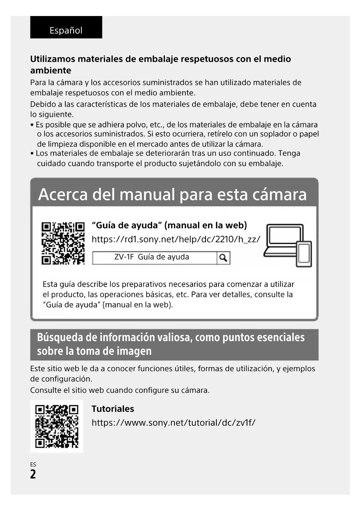 \\win-473\CAMERA\CX64700(YT)_SG\Multi\04_Compose\5041855311_17lang_STT\5041855311ZV1FCE3\03ES-ZV1FCE3\03ES.indd DTP data saved: 2022/07/06 12:05 PDF file created: 2022/07/06 12:05 Español Utilizamos materiales de embalaje respetuosos con el medio ambiente Para la cámara y los accesorios suministrados se han utilizado materiales de embalaje respetuosos con el medio ambiente.Debido a las características de los materiales de embalaje, debe tener en cuenta lo siguiente.• Es posible que se adhiera polvo, etc., de los materiales de embalaje en la cámara o los accesorios suministrados. Si esto ocurriera, retírelo con un soplador o papel de limpieza disponible en el mercado antes de utilizar la cámara.• Los materiales de embalaje se deteriorarán tras un uso continuado. Tenga cuidado cuando transporte el producto sujetándolo con su embalaje. Acerca del manual para esta cámara https://rd1.sony.net/help/dc/2210/h_zz/ “Guía de ayuda” (manual en la web) ZV-1F Guía de ayudaEsta guía describe los preparativos necesarios para comenzar a utilizar el producto, las operaciones básicas, etc. Para ver detalles, consulte la “Guía de ayuda” (manual en la web). Búsqueda de información valiosa, como puntos esenciales sobre la toma de imagen Este sitio web le da a conocer funciones útiles, formas de utilización, y ejemplos de configuración.Consulte el sitio web cuando configure su cámara. https://www.sony.net/tutorial/dc/zv1f/ TutorialesZV-1F 5-041-855-31(1)