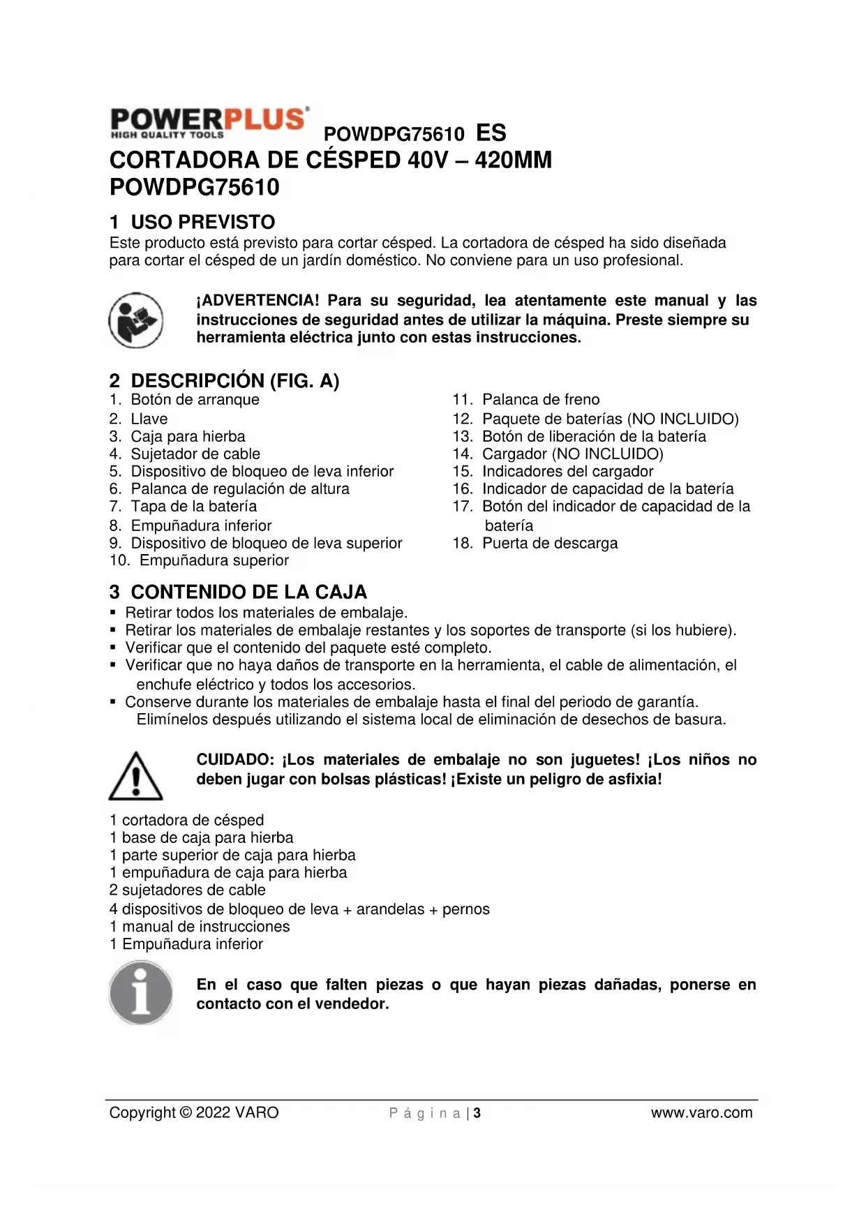 - Cuando esté listo para segar, vuelva a poner la llave y la batería.POWDPG75610 ES Copyright © 2022 VARO P á g i n a | 12 www.varo.com 10 UTILIZACIÓN