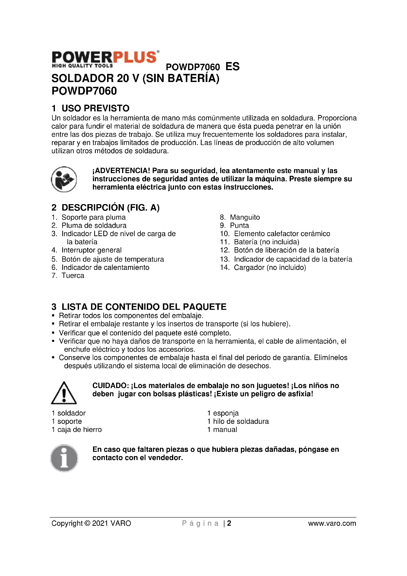 Copyright © 2021 VARO P á g i n a | 2 www.varo.com SOLDADOR 20 V (SIN BATERÍA) POWDP7060 1 USO PREVISTO Un soldador es la herramienta de mano más comúnmente utilizada en soldadura. Proporciona calor para fundir el material de soldadura de manera que ésta pueda penetrar en la unión entre las dos piezas de trabajo. Se utiliza muy frecuentemente los soldadores para instalar, reparar y en trabajos limitados de producción. Las líneas de producción de alto volumen utilizan otros métodos de soldadura. ¡ADVERTENCIA! Para su seguridad, lea atentamente este manual y las instrucciones de seguridad antes de utilizar la máquina. Preste siempre su herramienta eléctrica junto con estas instrucciones. 2 DESCRIPCIÓN (FIG. A)
