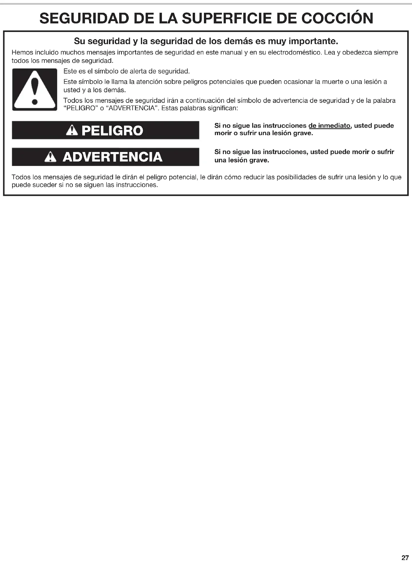 En EE. UU. ..................................................................................... 40 Accesorios ..................................................................................... 40 En Canadá ..................................................................................... 4027 SEGURIDAD DE LA SUPERFICIE DE COCCIÓN Si no sigue las instrucciones de inmediato, usted puede morir o sufrir una lesión grave. Si no sigue las instrucciones, usted puede morir o sufrir una lesión grave. Todos los mensajes de seguridad le dirán el peligro potencial, le dirán cómo reducir las posibilidades de sufrir una lesión y lo que puede suceder si no se siguen las instrucciones. Su seguridad y la seguridad de los demás es muy importante. Hemos incluido muchos mensajes importantes de seguridad en este manual y en su electrodoméstico. Lea y obedezca siempre todos los mensajes de seguridad. ADVERTENCIA PELIGRO Este es el símbolo de alerta de seguridad. Este símbolo le llama la atención sobre peligros potenciales que pueden ocasionar la muerte o una lesión a usted y a los demás. Todos los mensajes de seguridad irán a continuación del símbolo de advertencia de seguridad y de la palabra “PELIGRO” o “ADVERTENCIA”. Estas palabras significan:28