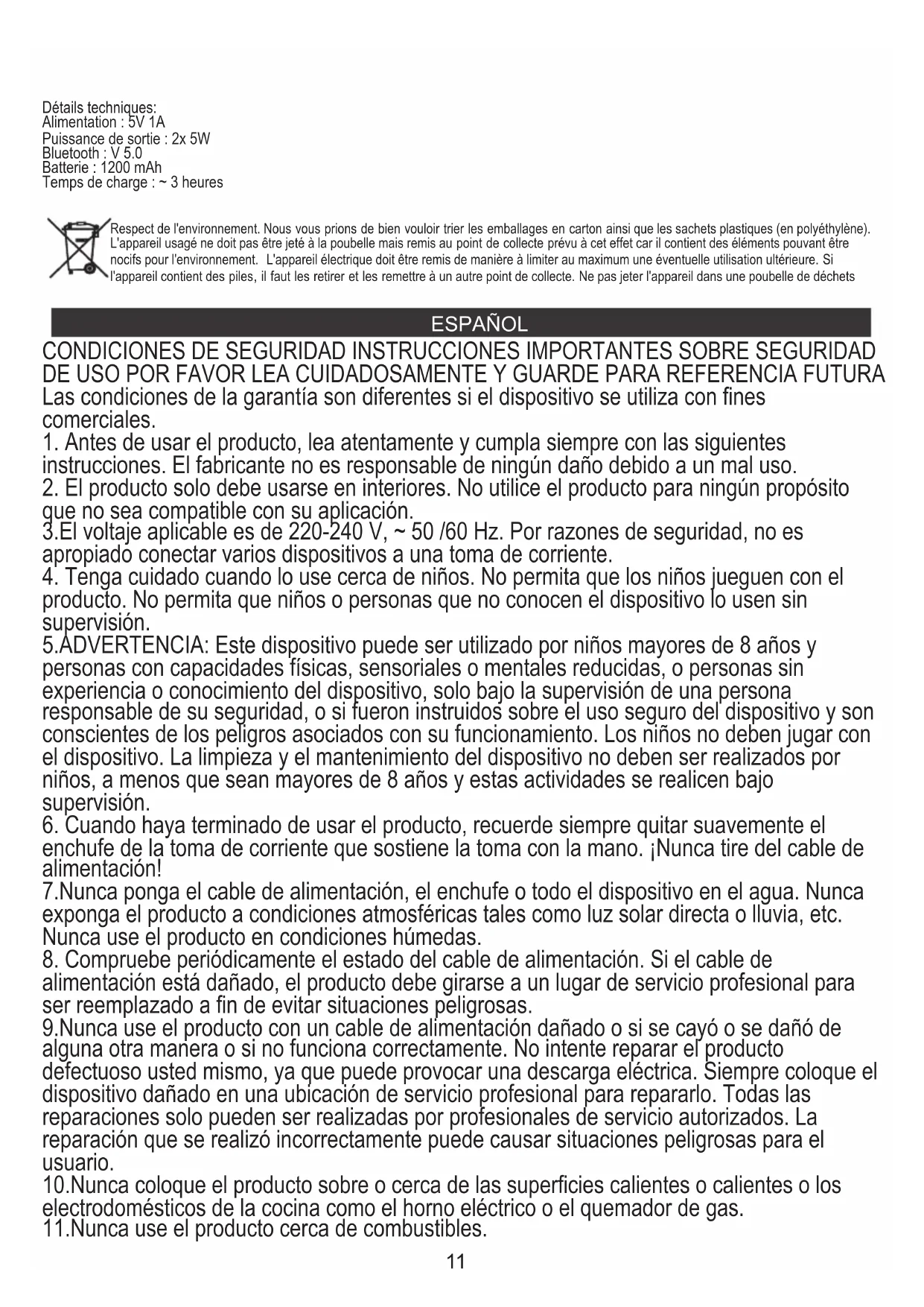 Preocupación por el medio ambiente. Por favor, lleva las cajas de cartón a un sitio de reciclaje. Las bolsas de polietileno se deben tirar al cubo de la basura amarillo (para envases). El equipo gastado debe ser entregado en el punto de almacenamiento adecuado, porque las piezas que constituyen el equipo pueden suponer un peligro para el medio ambiente. Debes entregar el equipo Hay que devolver el equipo eléctrico con el fin de evitar su reutilización. Si en el equipo se encuentran pilas, hay que sacarlas y entregar por separado, en un punto de almacenamiento adecuado. No tires el equipo al contenedor para residuos urbanos!!14 PORTUGUÊS CONDIÇÕES DE SEGURANÇA INSTRUÇÕES IMPORTANTES SOBRE SEGURANÇA DE USO LEIA COM ATENÇÃO E MANTENHA-SE PARA FUTURA REFERÊNCIA As condições da garantia são diferentes se o dispositivo for usado para fins comerciais.