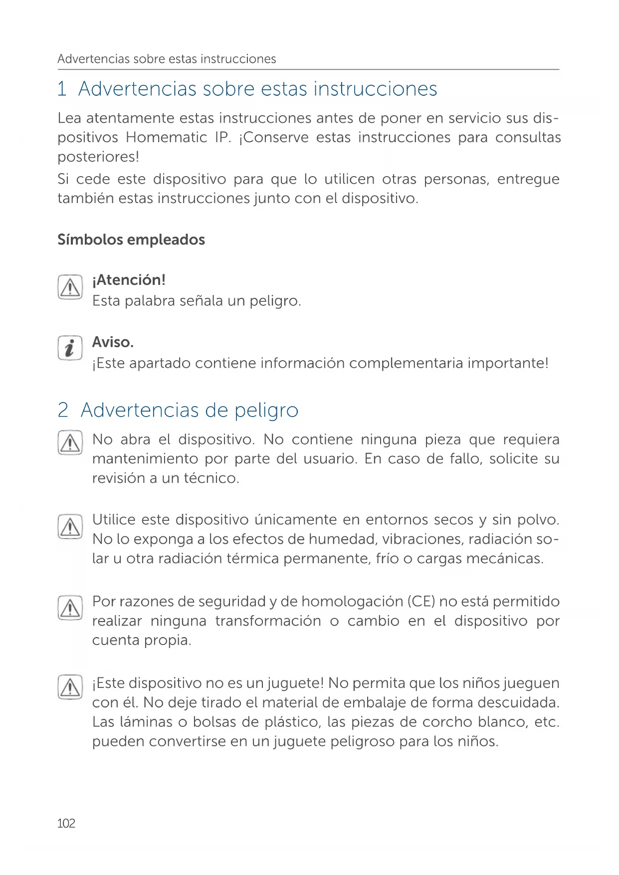 - 13 Datos técnicos 02 Advertencias sobre estas instrucciones 1 Advertencias sobre estas instrucciones Lea atentamente estas instrucciones antes de poner en servicio sus dis- positivos Homematic IP. ¡Conserve estas instrucciones para consultas posteriores! Si cede este dispositivo para que lo utilicen otras personas, entregue también estas instrucciones junto con el dispositivo. Símbolos empleados ¡Atención! Esta palabra señala un peligro. Aviso. ¡Este apartado contiene información complementaria importante! 2 Advertencias de peligro No abra el dispositivo. No contiene ninguna pieza que requiera mantenimiento por parte del usuario. En caso de fallo, solicite su revisión a un técnico. Utilice este dispositivo únicamente en entornos secos y sin polvo. No lo exponga a los efectos de humedad, vibraciones, radiación so- lar u otra radiación térmica permanente, frío o cargas mecánicas. Por razones de seguridad y de homologación (CE) no está permitido realizar ninguna transformación o cambio en el dispositivo por cuenta propia. ¡Este dispositivo no es un juguete! No permita que los niños jueguen con él. No deje tirado el material de embalaje de forma descuidada. Las láminas o bolsas de plástico, las piezas de corcho blanco, etc. pueden convertirse en un juguete peligroso para los niños.103 Funciones y esquema del dispositivo Se declina toda responsabilidad por los daños personales o materia- les causados por un uso indebido o por incumplimiento de las ad- vertencias de peligro. ¡En esos casos se anula el derecho a garantía! ¡No se asume ninguna responsabilidad por daños indirectos! El dispositivo está diseñado para el uso exclusivamente en viviendas, entornos comerciales y profesionales o pequeñas empresas. Tenga en cuenta que la regulación de la temperatura ambiente con el termostato de radiador está pensada para un sistema de calefac- ción de dos tubos por radiador, uno de salida y otro de retorno. Si se utilizan sistemas de calefacción monotubulares pueden producirse fuertes variaciones en las temperaturas ajustadas debido a las fluc- tuaciones en la temperatura de salida. Todo uso distinto del indicado en estas instrucciones se considera incorrecto y conlleva la anulación de la garantía y la responsabilidad. 3 Funciones y esquema del dispositivo Con Homematic IP Termostato de radiador puede regular la temperatura ambiente de su hogar inteligente por tiempos o en función de sus necesida- des. Mediante perfiles de tiempo puede adaptar fácilmente los cambios de temperatura a sus preferencias. El diseño de la carcasa seguro frente a manipulaciones, con posibilidad de precintarlo, y el bloqueo de manejo incorporado, con introducción de un PIN personal, protegen al termostato contra el manejo no deseado. Aún más se- guridad proporciona la protección contra el desmontaje suministrada junto con el dispositivo. Puede realizar la configuración del termostato para radiador según sus prefe- rencias directamente en el aparato. Además, en combinación con un Home- matic IP Access Point, también puede realizar el control del termostato de ra- diador cómodamente desde la app gratuita para smartphone HomematicIP. Si se dispone de un Homematic IP Contacto para ventanas y puertas, el sis- tema baja automáticamente la temperatura cuando se ventila para no derro- char energía.104 Funciones y esquema del dispositivoEl termostato de radiador es compatible con todas las válvulas de radiador habituales y es muy fácil de montar. Para ello no es necesario vaciar el agua del radiador ni modificar nada en el sistema de calefacción. Esquema del dispositivo (v. figura 1): (A) Tuerca de metal(B) Pantalla LC(C) Botón de más(D) Botón de Menú/Boost y LED de equipos(E) Botón de menos(F) Tapa del compartimento de las pilasEsquema de la pantalla (v. figura 2): PrgOffsetAUTOMANUBOOST Mo Tu We Th Fr Sa Su p. 1291