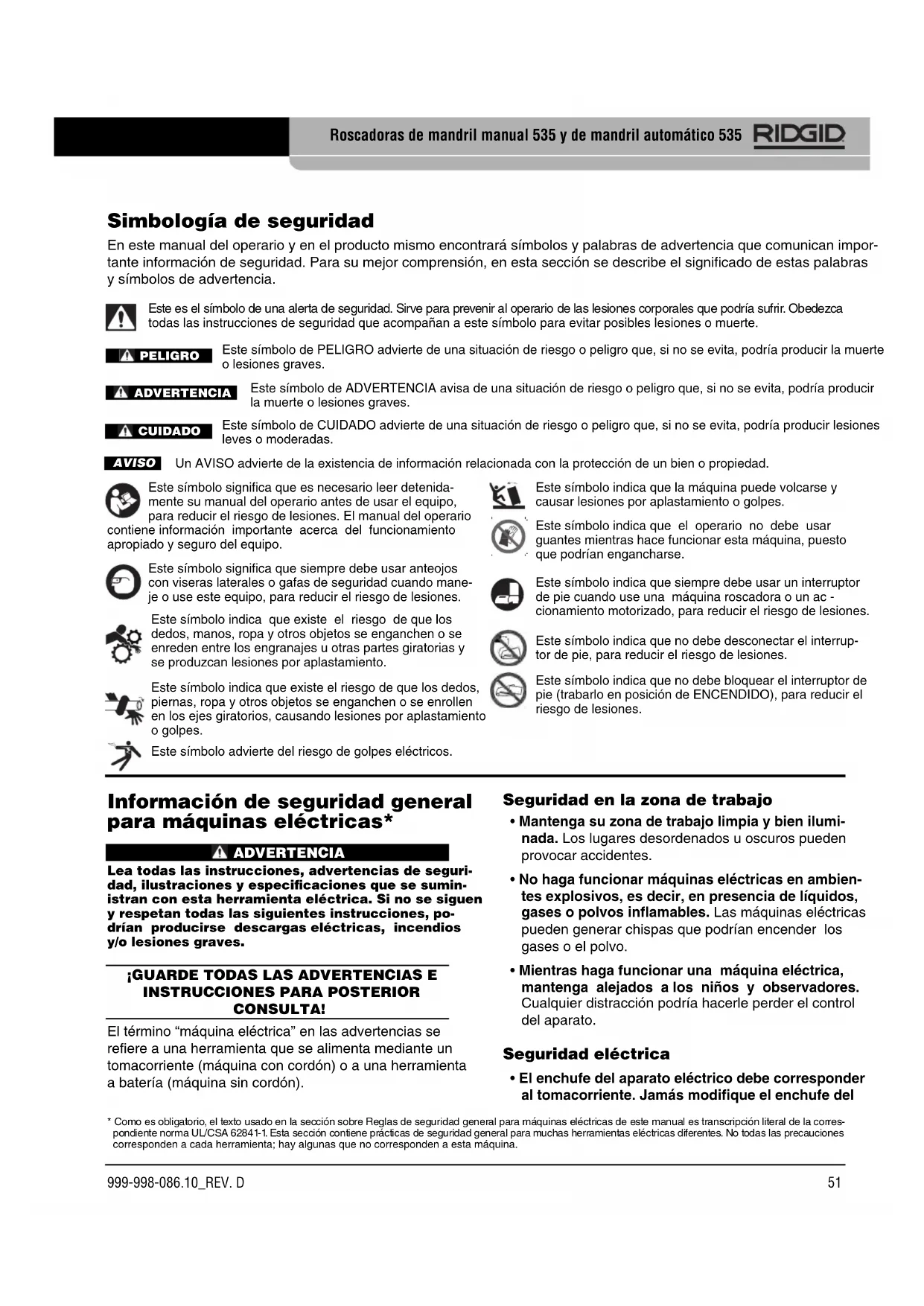 - El servicio de las máquinas eléctricas debe encomendarse a técnicos de reparación califica- dos que usen solamente repuestos idénticos a las piezas originales. Esto mantiene la seguridad de la máquina eléctrica. Información de seguridad especíca ADVERTENCIA Esta sección contiene información de seguridad importante que es especíca para estas herramien- tas. Antes de utilizar la roscadora de mandril manual 535 o la roscadora de mandril automático 535, lea estas instrucciones detenidamente para reducir el riesgo de choque de electricidad o de otras lesiones graves.