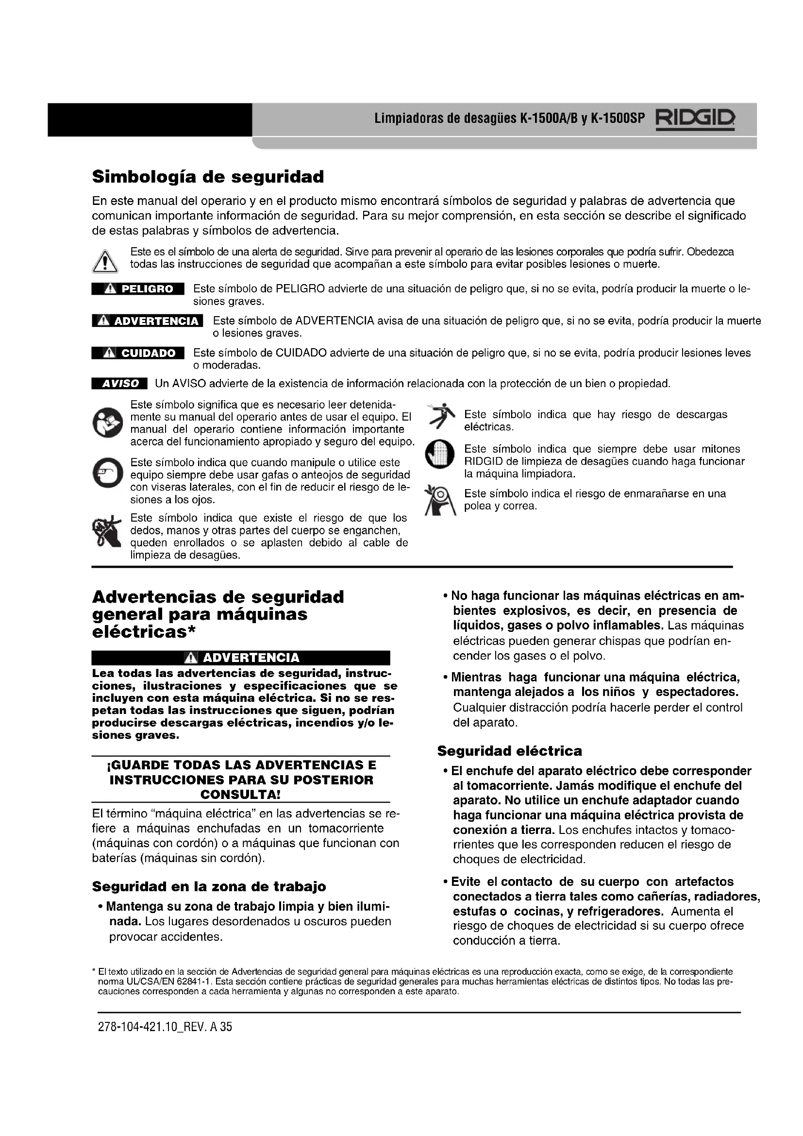 - Mantenga su zona de trabajo limpia y bien ilumi- nada. Los lugares desordenados u oscuros pueden provocar accidentes. Este símbolo indica que existe el riesgo de que los dedos, manos y otras partes del cuerpo se enganchen, queden enrollados o se aplasten debido al cable de limpieza de desagües. Simbología de seguridad En este manual del operario y en el producto mismo encontrará símbolos de seguridad y palabras de advertencia que comunican importante información de seguridad. Para su mejor comprensión, en esta sección se describe el significado de estas palabras y símbolos de advertencia. Este es el símbolo de una alerta de seguridad. Sirve para prevenir al operario de las lesiones corporales que podría sufrir. Obedezca todas las instrucciones de seguridad que acompañan a este símbolo para evitar posibles lesiones o muerte. Este símbolo de PELIGRO advierte de una situación de peligro que, si no se evita, podría producir la muerte o le- siones graves. Este símbolo de ADVERTENCIA avisa de una situación de peligro que, si no se evita, podría producir la muerte o lesiones graves. Este símbolo de CUIDADO advierte de una situación de peligro que, si no se evita, podría producir lesiones leves o moderadas. Un AVISO advierte de la existencia de información relacionada con la protección de un bien o propiedad. Este símbolo significa que es necesario leer detenida- mente su manual del operario antes de usar el equipo. El manual del operario contiene información importante acerca del funcionamiento apropiado y seguro del equipo. Este símbolo indica que cuando manipule o utilice este equipo siempre debe usar gafas o anteojos de seguridad con viseras laterales, con el fin de reducir el riesgo de le- siones a los ojos. AVISOPELIGROADVERTENCIACUIDADO Este símbolo indica que hay riesgo de descargas eléctricas. Este símbolo indica que siempre debe usar mitones RIDGID de limpieza de desagües cuando haga funcionar la máquina limpiadora. Este símbolo indica el riesgo de enmarañarse en una polea y correa.
