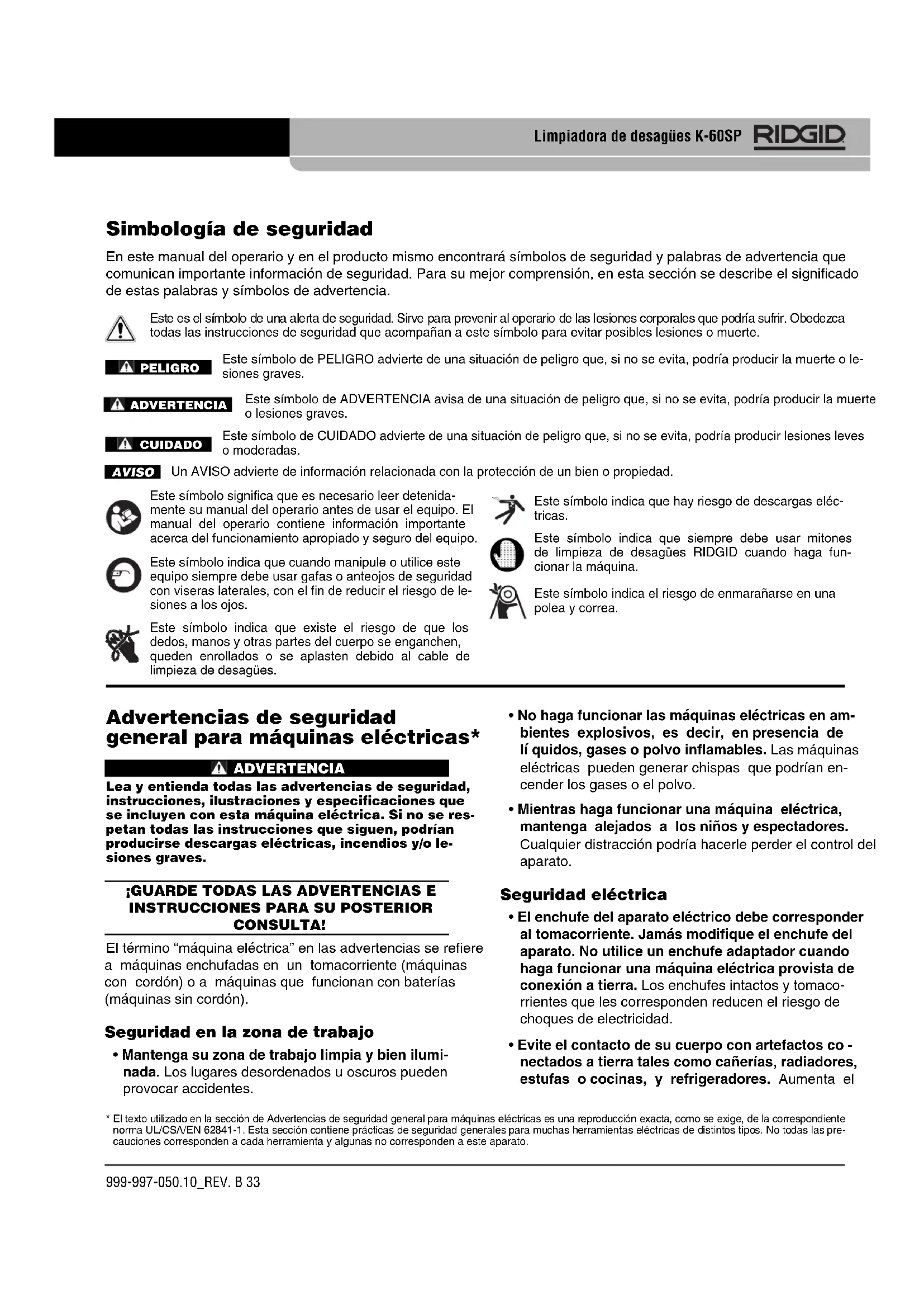 - Evite el contacto de su cuerpo con artefactos co - nectados a tierra tales como cañerías, radiadores, estufas o cocinas, y refrigeradores. Aumenta el Este símbolo indica que existe el riesgo de que los dedos, manos y otras partes del cuerpo se enganchen, queden enrollados o se aplasten debido al cable de limpieza de desagües. Simbología de seguridad En este manual del operario y en el producto mismo encontrará símbolos de seguridad y palabras de advertencia que comunican importante información de seguridad. Para su mejor comprensión, en esta sección se describe el significado de estas palabras y símbolos de advertencia. Este es el símbolo de una alerta de seguridad. Sirve para prevenir al operario de las lesiones corporales que podría sufrir. Obedezca todas las instrucciones de seguridad que acompañan a este símbolo para evitar posibles lesiones o muerte. Este símbolo de PELIGRO advierte de una situación de peligro que, si no se evita, podría producir la muerte o le- siones graves. Este símbolo de ADVERTENCIA avisa de una situación de peligro que, si no se evita, podría producir la muerte o lesiones graves. Este símbolo de CUIDADO advierte de una situación de peligro que, si no se evita, podría producir lesiones leves o moderadas. Un AVISO advierte de información relacionada con la protección de un bien o propiedad. Este símbolo significa que es necesario leer detenida- mente su manual del operario antes de usar el equipo. El manual del operario contiene información importante acerca del funcionamiento apropiado y seguro del equipo. Este símbolo indica que cuando manipule o utilice este equipo siempre debe usar gafas o anteojos de seguridad con viseras laterales, con el fin de reducir el riesgo de le- siones a los ojos. AVISOPELIGROADVERTENCIACUIDADO Este símbolo indica que hay riesgo de descargas eléc- tricas. Este símbolo indica que siempre debe usar mitones de limpieza de desagües RIDGID cuando haga fun- cionar la máquina. Este símbolo indica el riesgo de enmarañarse en una polea y correa.