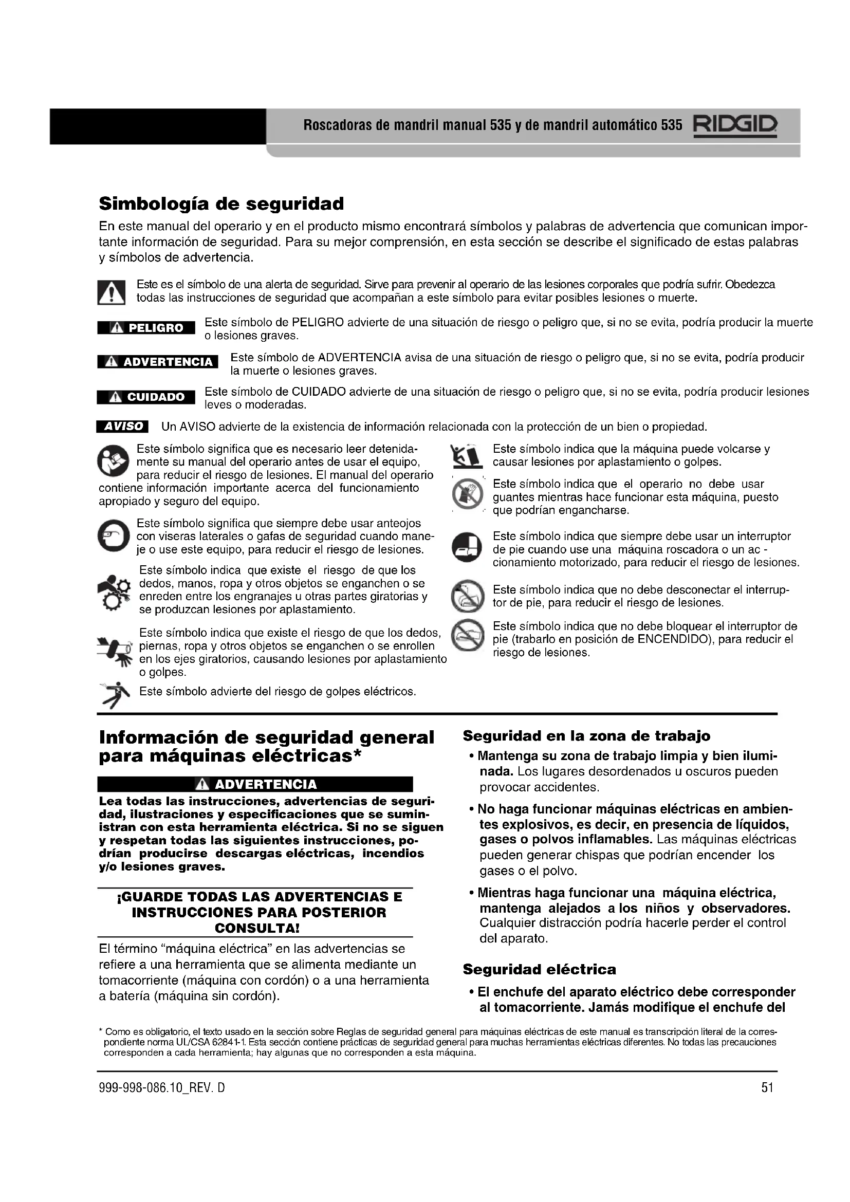 Roscadoras de mandril manual 535 y de mandril automático 535 Información de seguridad general para máquinas eléctricas* ADVERTENCIA Lea todas las instrucciones, advertencias de seguri- dad, ilustraciones y especicaciones que se sumin- istran con esta herramienta eléctrica. Si no se siguen y respetan todas las siguientes instrucciones, po- drían producirse descargas eléctricas, incendios y/o lesiones graves.