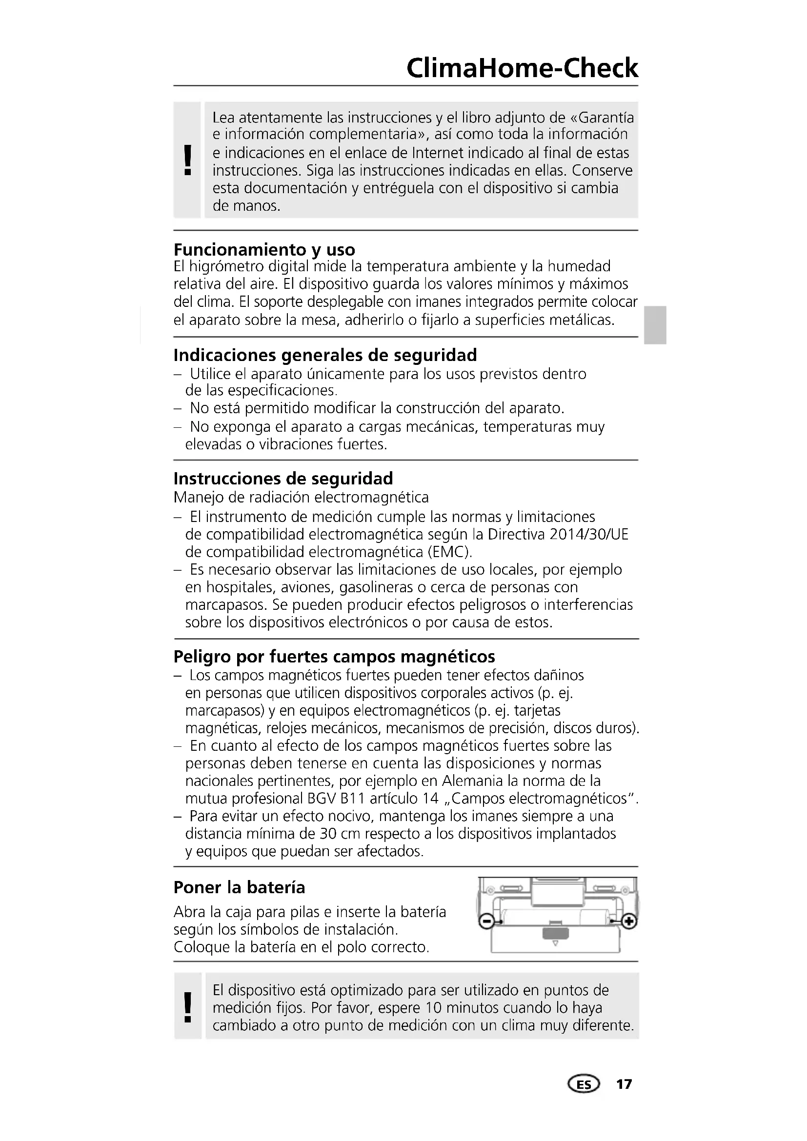Poner la batería Abra la caja para pilas e inserte la batería según los símbolos de instalación. Coloque la batería en el polo correcto. Instrucciones de seguridad Manejo de radiación electromagnética – El instrumento de medición cumple las normas y limitaciones de compatibilidad electromagnética según la Directiva 2014/30/UE de compatibilidad electromagnética (EMC). – Es necesario observar las limitaciones de uso locales, por ejemplo en hospitales, aviones, gasolineras o cerca de personas con marcapasos. Se pueden producir efectos peligrosos o interferencias sobre los dispositivos electrónicos o por causa de estos. Indicaciones generales de seguridad – Utilice el aparato únicamente para los usos previstos dentro de las especicaciones. – No está permitido modicar la construcción del aparato. – No exponga el aparato a cargas mecánicas, temperaturas muy elevadas o vibraciones fuertes. Lea atentamente las instrucciones y el libro adjunto de «Garantía e información complementaria», así como toda la información e indicaciones en el enlace de Internet indicado al final de estas instrucciones. Siga las instrucciones indicadas en ellas. Conserve esta documentación y entréguela con el dispositivo si cambia de manos.