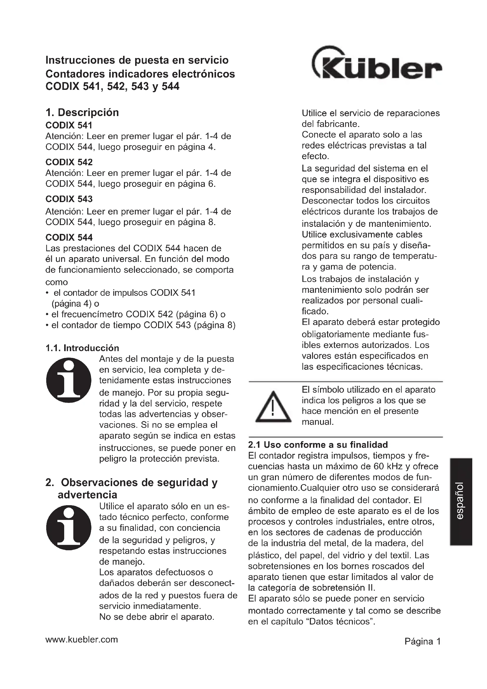 La parte delantera solo se debe limpiar con un paño humedecido con agua. No está prevista la limpieza de la parte trasera, que será re- sponsabilidad del instalador o del personal de mantenimiento. En funcionamiento normal, este aparato no necesita mantenimiento. Si el aparato no funcionara de manera correcta, habrá que en-Página 4 www.kuebler.com Modo contador de impulsos. Proseguir en pár. 4, CODIX 541 en página 4. Modo frecuencímetro. Prose- guir en pár. 4, CODIX 542 en página 6. Modo contador de tiempo. Proseguir en pár. 4, CODIX 543 en página 8. En caso de devolución, adjuntar una breve de- scripción del defecto, de la programación y del esquema de empalme con el fin de reproducir cualquier defecto y asegurar la reparación ráp- ida de su aparato.