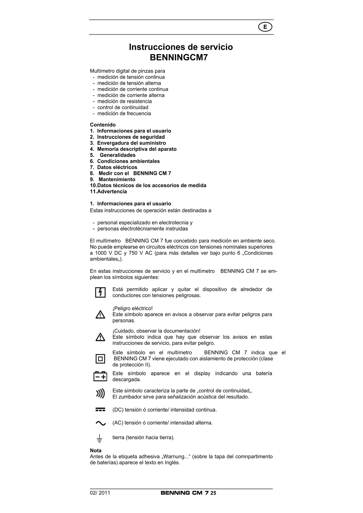Instrucciones de servicio BENNING CM 7 Multímetro digital de pinzas para - medición de tensión continua - medición de tensión alterna - medición de corriente continua - medición de corriente alterna - medición de resistencia - control de continuidad - medición de frecuencia Contenido