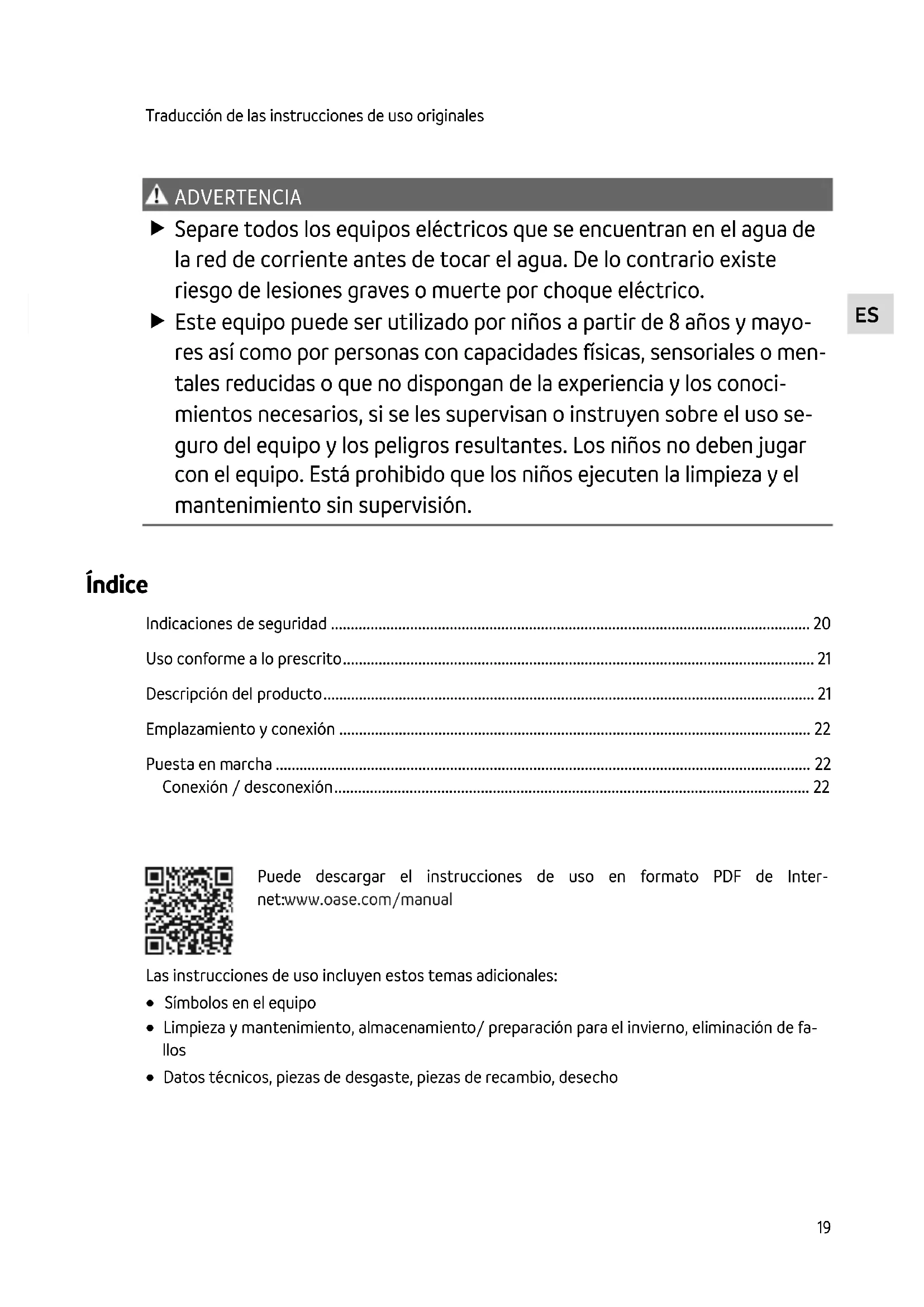 Puede descargar el instrucciones de uso en formato PDF de Inter- net: www.oase.com/manual Las instrucciones de uso incluyen estos temas adicionales: