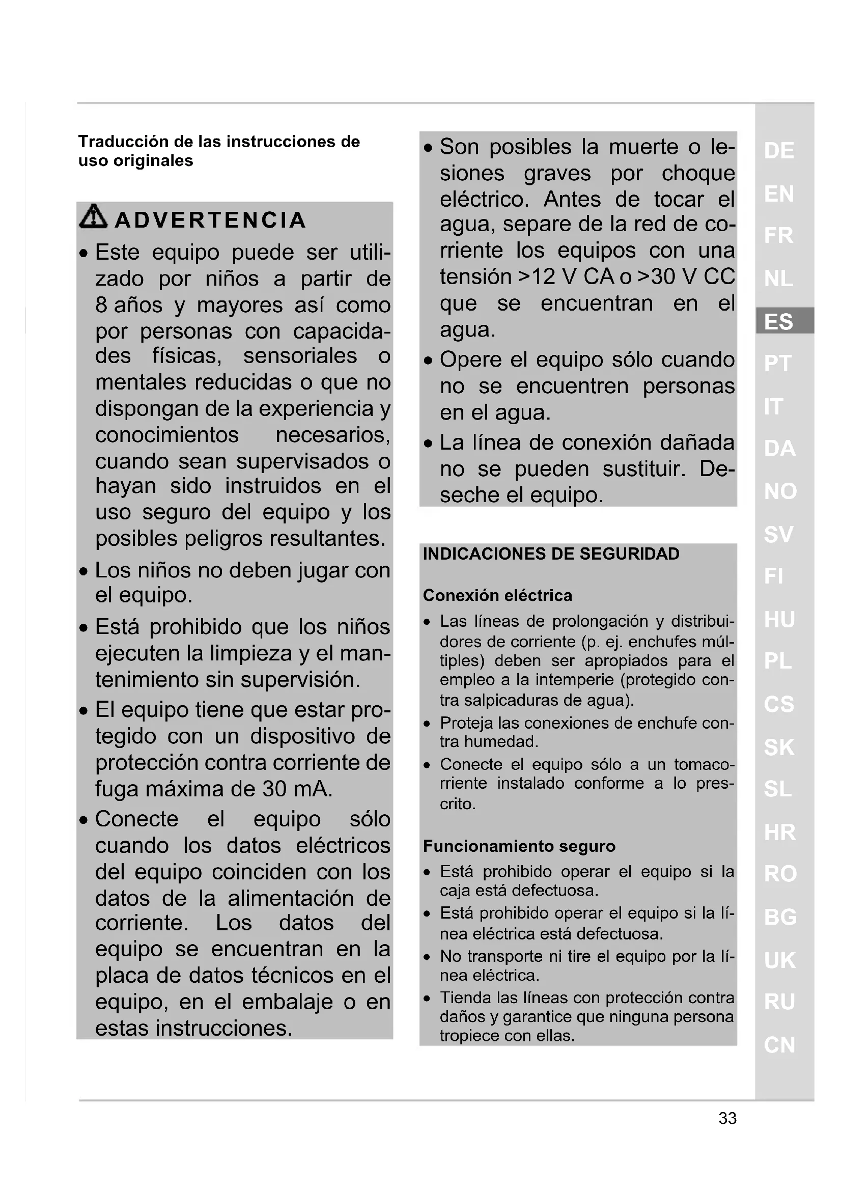 - Son posibles la muerte o le- siones graves por choque eléctrico. Antes de tocar el agua, separe de la red de co- rriente los equipos con una tensión >12 V CA o >30 V CC que se encuentran en el agua.