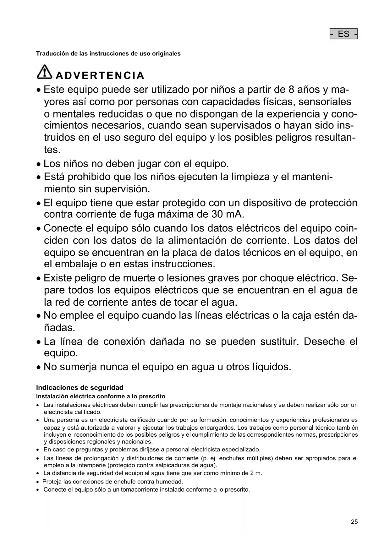 Las lineas de prolongacion y distribuidores de corriente (p. ej. enchufes multiples) deben ser apropiados para el empleo a la intemperie (protegado contra salpicaduras de agua). - La distancia de seguridad del equipo al agua tiene que ser como minimo de 2m .
