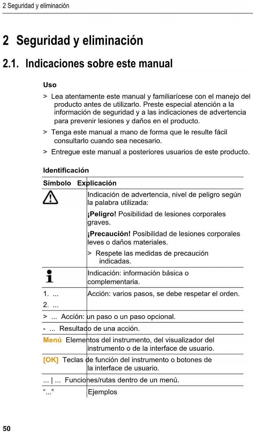 Pos: 2 /TD/Überschr iften/2. Sicher heit und Umwelt @ 0\mod_11737747 19351_206.doc @ 294 @ 1 @ 1 2 Seguridad y eliminación Pos: 3 /TD/Überschr iften/2.1 Zu diesem Doku ment @ 0\mod_117377525235 1_206.doc @ 348 @ 2 @ 1 2.1. Indicaciones sobre este manual Pos: 4 /TD/Sicherhei t und Umwelt/Zu diesem Doku ment/VerwendungVer wendung (Standard) @ 0\ mod_1173775068554_206. doc @ 339 @ 5 @ 1 Uso > Lea atentamente este manual y familiarícese con el manejo del producto antes de utilizarlo. Preste especial atención a la información de seguridad y a las indicaciones de advertencia para prevenir lesiones y daños en el producto. > Tenga este manual a mano de forma que le resulte fácil consultarlo cuando sea necesario. > Entregue este manual a posteriores usuarios de este producto. Pos: 5 /TD/Sicherhei t und Umwelt/Zu diesem Doku ment/Symbole und Schr eibkonventionenSy mbole und Schreibkonv. [ Standard_groß] @ 0\mod_1174 982140622_206.doc @ 517 @ 5 @ 1 Identificación Símbolo Explicación Indicación de advertencia, nivel de peligro según la palabra utilizada: ¡Peligro! Posibilidad de lesiones corporales graves. ¡Precaución! Posibilidad de lesiones corporales leves o daños materiales. > Respete las medidas de precaución indicadas. Indicación: información básica o complementaria.