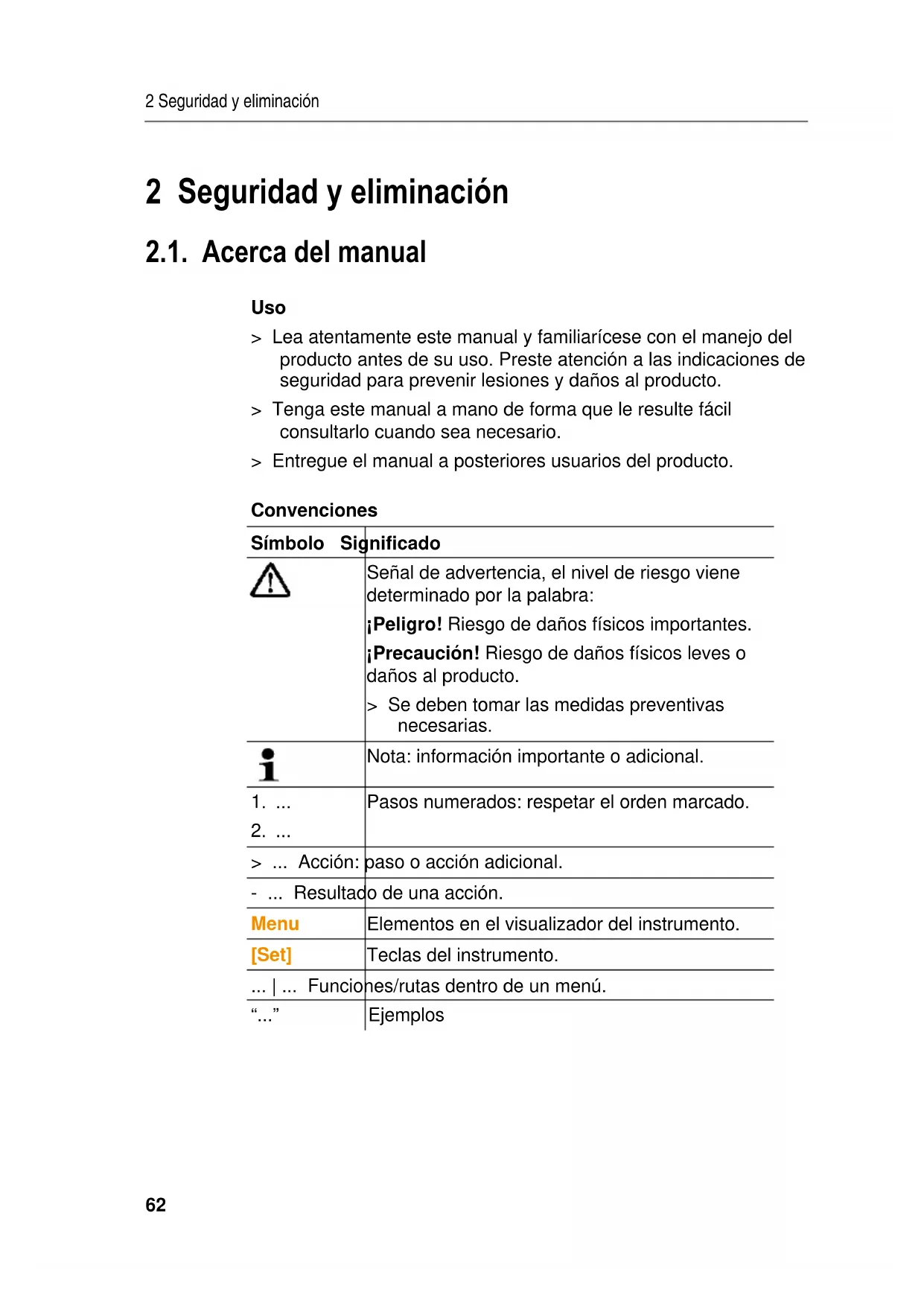 Pos: 2 /TD/Überschr iften/2. Sicher heit und Umwelt @ 0\mod_117377471935 1_79.doc @ 292 @ 1 2 Seguridad y eliminación Pos: 3 /TD/Überschr iften/2.1 Zu diesem Dokume nt @ 0\mod_117377525235 1_79.doc @ 346 @ 2 2.1. Acerca del manual Pos: 4 /TD/Sicherhei t und Umwelt/Zu diesem Doku ment/Verwendung (Standar d) @ 0\mod_11737750685 54_79.doc @ 337 @ 5 Uso > Lea atentamente este manual y familiarícese con el manejo del producto antes de su uso. Preste atención a las indicaciones de seguridad para prevenir lesiones y daños al producto. > Tenga este manual a mano de forma que le resulte fácil consultarlo cuando sea necesario. > Entregue el manual a posteriores usuarios del producto. Pos: 5 /TD/Sicherhei t und Umwelt/Zu diesem Doku ment/Symbole und Schr eibkonventionen/Sym bole und Schreibkonv. [te sto622/623 @ 4\mod_1249 373225894_79.doc @ 47075 @ 5 Convenciones Símbolo Significado Señal de advertencia, el nivel de riesgo viene determinado por la palabra: ¡Peligro! Riesgo de daños físicos importantes. ¡Precaución! Riesgo de daños físicos leves o daños al producto. > Se deben tomar las medidas preventivas necesarias. Nota: información importante o adicional.