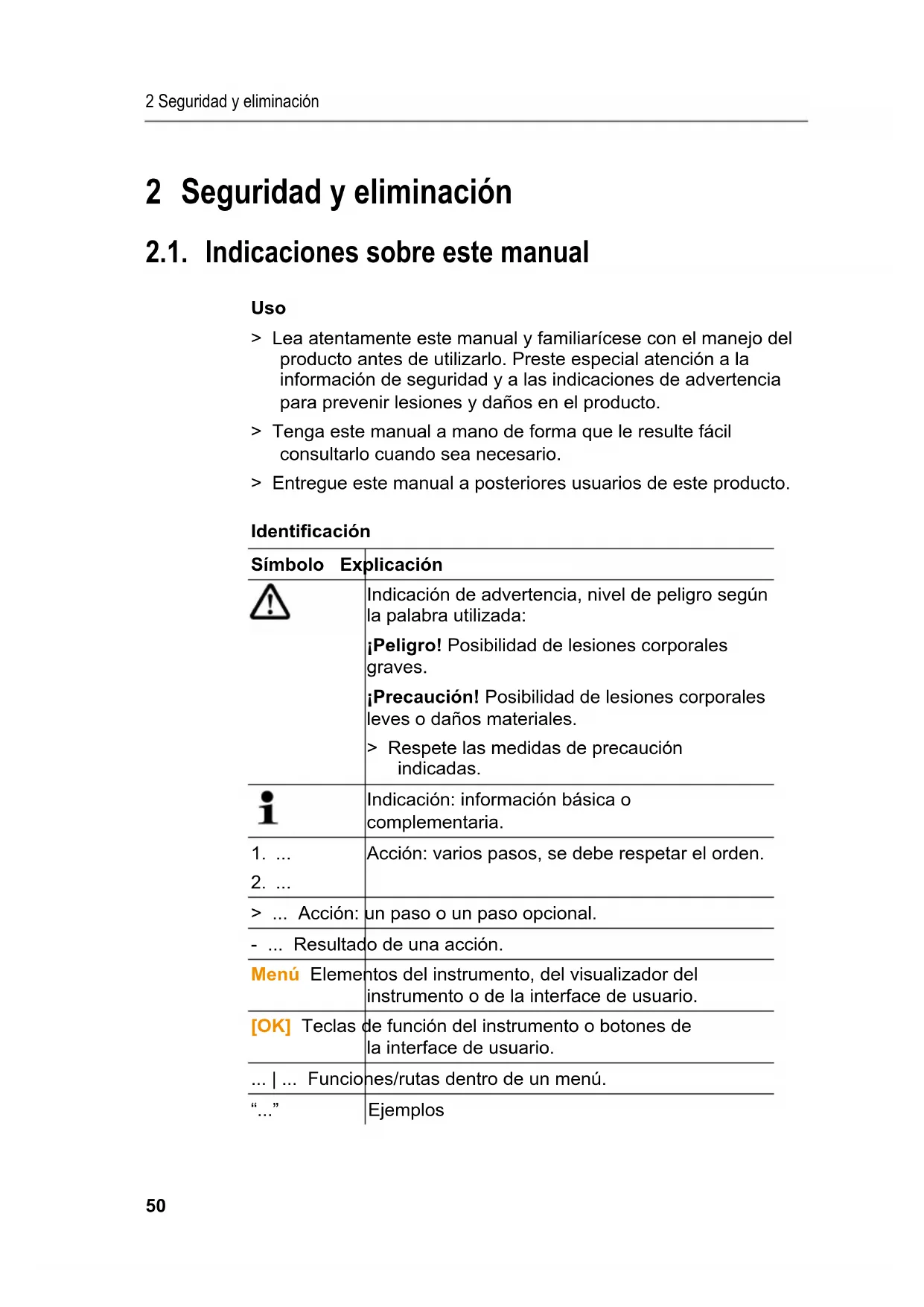 Pos: 2 /TD/Überschr iften/2. Sicher heit und Umwelt @ 0\mod_11737747 19351_206.doc @ 294 @ 1 @ 1 2 Seguridad y eliminación Pos: 3 /TD/Überschr iften/2.1 Zu diesem Doku ment @ 0\mod_117377525235 1_206.doc @ 348 @ 2 @ 1 2.1. Indicaciones sobre este manual Pos: 4 /TD/Sicherhei t und Umwelt/Zu diesem Doku ment/VerwendungVer wendung (Standard) @ 0\ mod_1173775068554_206. doc @ 339 @ 5 @ 1 Uso > Lea atentamente este manual y familiarícese con el manejo del producto antes de utilizarlo. Preste especial atención a la información de seguridad y a las indicaciones de advertencia para prevenir lesiones y daños en el producto. > Tenga este manual a mano de forma que le resulte fácil consultarlo cuando sea necesario. > Entregue este manual a posteriores usuarios de este producto. Pos: 5 /TD/Sicherhei t und Umwelt/Zu diesem Doku ment/Symbole und Schr eibkonventionenSy mbole und Schreibkonv. [ Standard_groß] @ 0\mod_1174 982140622_206.doc @ 517 @ 5 @ 1 Identificación Símbolo Explicación Indicación de advertencia, nivel de peligro según la palabra utilizada: ¡Peligro! Posibilidad de lesiones corporales graves. ¡Precaución! Posibilidad de lesiones corporales leves o daños materiales. > Respete las medidas de precaución indicadas. Indicación: información básica o complementaria.