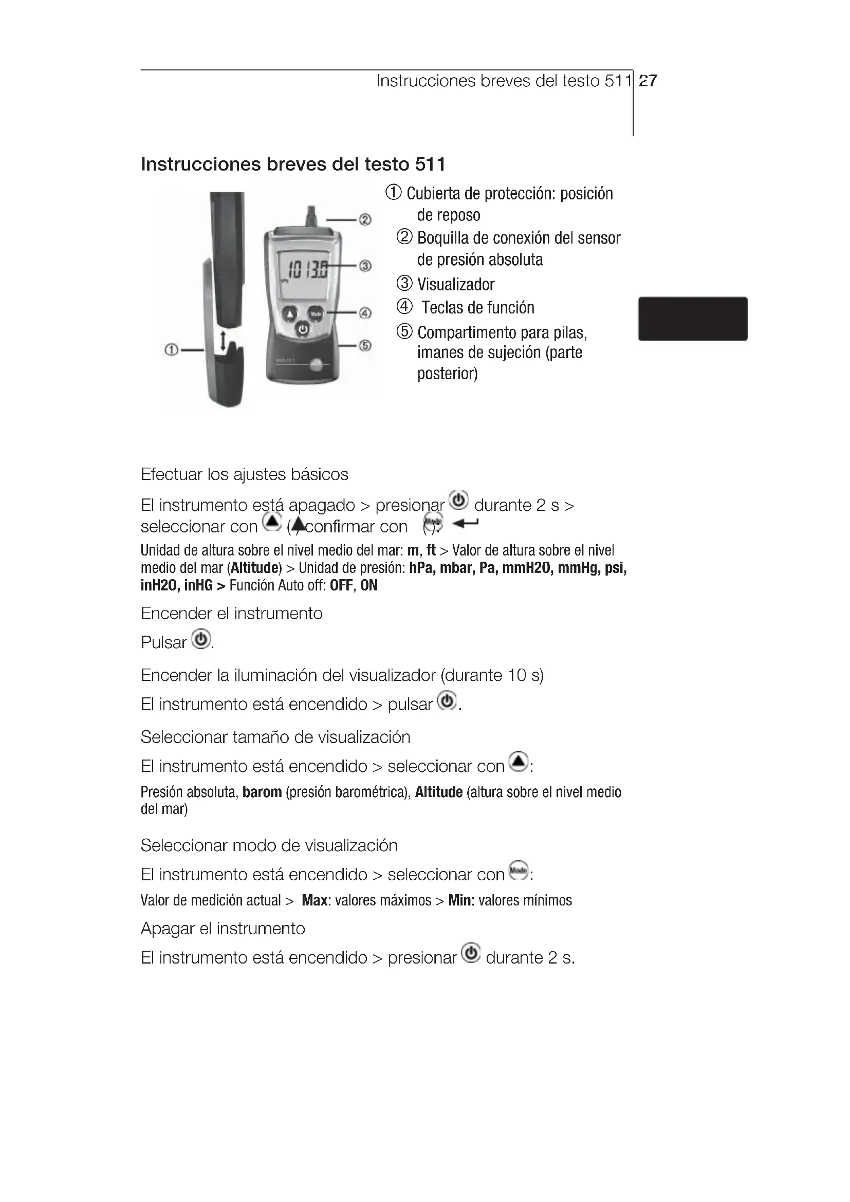 - Duración: 2 años, condiciones de garantía: ver página de internet www.testo.com/warranty deenfresitptsvnl????Descripción del producto30 Descripción del producto Vista general Cubierta de protección: posición de reposo Boquilla de conexión del sensor de presión absoluta Visualizador Teclas de función Compartimento para pilas imanes de sujeción (parte posterior) Primeros pasos Colocar las pilas: 1 Abrir el compartimento para pilas: deslizar hacia abajo la tapa. 2 Colocar las pilas (2 de 1,5 V, tipo AAA). Respetar la polaridad. 3 Cerrar el compartimento para pilas: deslizar hacia arriba la tapa. Efectuar los ajustes básicos (modo de configuración): Funciones ajustables