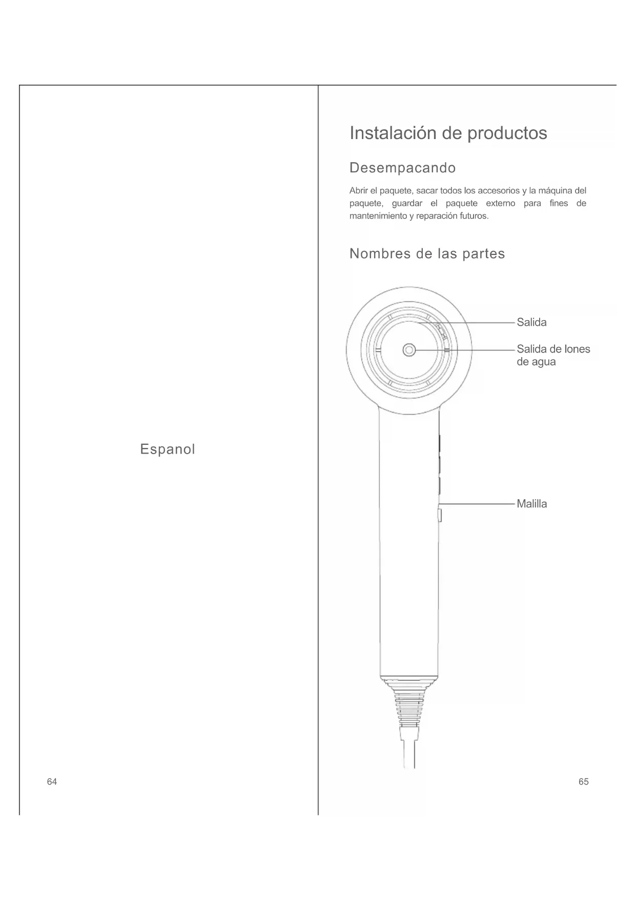 6362Espanol Nombres de las partes Abrir el paquete, sacar todos los accesorios y la máquina del paquete, guardar el paquete externo para fines de mantenimiento y reparación futuros. Instalación de productos Desempacando Salida Salida de lones de agua Malilla 6564Entrada Velocidad Temperatura Encendido / apagado Cable de alimentación