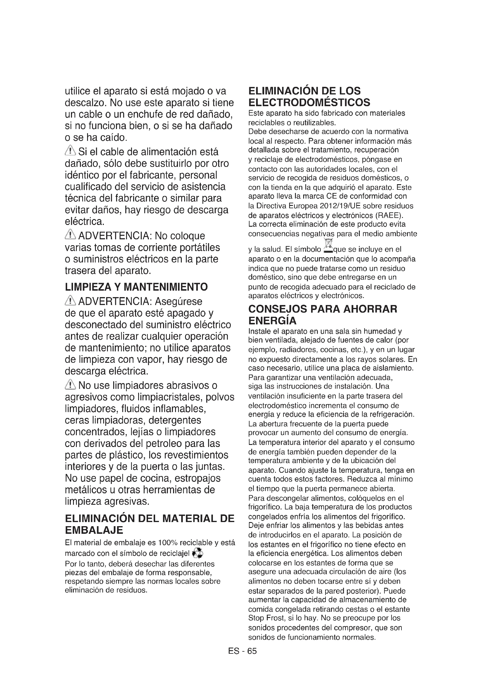 ESIMPORTANTEQUELEAYSIGALASSIGUIENTESRECOMENDACIONESES-62 tuberíasdelcircuitoderefrigeración delelectrodoméstico. ADVERTENCIA:Mantenga despejadaslosoriciosdeventilación delaparatoolaestructura. ADVERTENCIA:Nousemedios mecánicos,eléctricosoquímicos, exceptolosindicadosporel fabricante,paraacelerarelprocesode descongelación ADVERTENCIA:Nousenicoloque dispositivoseléctricosdentrodelos compartimentosdelelectrodoméstico, salvoquesetratedeaquellos autorizadosexpresamenteporel fabricante. ADVERTENCIA:Lasmáquinasde hieloolosdispensadoresdeaguaque noesténconectadosdirectamente alatomadeaguadebenllenarse solamenteconaguapotable. ADVERTENCIA:Losproductores automáticosdehieloylos dispensadoresdeaguadebenestar conectadosaunatomadeaguaque solosuministreaguapotableconuna presióndelaguacomprendidaentre 0,17y0,81MPa(1,7y8,1bar). Noalmacenesustancias explosivas,comoaerosoles,ni coloqueniutilicegasolinauotros materialesinamablesencimaocerca delelectrodoméstico. Noingieraelcontenido(noes tóxico)de losacumuladoresdefrío(suministrado con algunosmodelos).Nocomacubitos dehielonipolosinmediatamente despuésdesacarlosdelcongelador, yaquepuedenprovocarquemaduras porfrío. Paralosproductosdiseñados parafuncionarconunltrodeaire integradosenunacubiertadel ventiladoraccesible,elltrodebe estarsiemprebiencolocadosiel frigorícoestáenfuncionamiento. Noguarderecipientesdecristal conlíquidosenelcompartimento congeladoryaquepodríanromperse. Noobstruyaelventilador(sise incluye)conlosalimentos.Después decolocarlosalimentoscompruebe quelaspuertasdeloscompartimentos cierrancorrectamente,especialmente lapuertadelcongelador. Lasjuntasdañadasdeben sustituirseloantesposible. Utiliceelcompartimentodel frigorícosolamenteparaconservar alimentosfrescosyelcompartimento delcongeladorsolamentepara conservaralimentoscongelados, congelaralimentosfrescosyhacer cubitosdehielo. Envuelvalosalimentospara guardarlos;deestemodoseevita queentrenencontactodirectoconlas superciesinterioresdelfrigorícoo delcongelador.Losaparatospodrían incluircompartimentosespeciales (compartimentodealimentosfrescos, compartimentodecerogrados,...). Sinoseespecicalocontrarioenel folletoespecícodelproductopueden retirarse,manteniendorendimientos equivalentes. ElpentanoCseutilizacomo agenteexpansorenlaespuma aislanteyesungasinamable. Estossonloscompartimentosmás apropiadosdelaparatoenlosque conservarlosalimentosteniendo encuentaladistintadistribuciónde temperaturaencadacompartimento delaparato: -Compartimentodelfrigoríco: 1)Zonasuperiordelcompartimento delfrigoríco&puerta:zonade temperatura:ParaconservarfrutasES-63 tropicales,latas,bebidas,huevos, salsas,encurtidos,mantequillay mermelada 2)Zonamediadelcompartimentodel frigoríco:zonafría:Paraconservar queso,leche,productoslácteos, delicatessenyyogures 3)Zonainferiordelcompartimento delfrigoríco:zonamásfría:Para almacenarambres,postres,carne ypescado,tartasdequeso,pasta fresca,natasagrias,pesto/salsas, comidascaserascocinadas,pastas, pudinesyquesoscremosos 4)Cajóndefrutasyverduras&enla parteinferiordelcompartimentodel frigoríco:Paraconservarfrutasy verduras(exceptofrutastropicales) 5)Compartimentoabatidor:Para conservarsolamentecarneypescado enelcajónmásfrío -Compartimentodelcongelador: Elcompartimentodelazonade4 estrellas(****)esaptoparacongelar alimentosqueestánatemperatura ambienteyparaconservaralimentos congelados,yaquelatemperatura sedistribuyedemanerauniformepor todoelcompartimento.Losalimentos quesecomprancongeladostienen lafechadecaducidadindicadaenel envase.Estafechatieneencuenta eltipodealimentoqueseconserva y,portanto,sedeberespetar.Los alimentosfrescosdebenconservarse durantelossiguientesperiodosde tiempo:1-3mesesparalosquesos, moluscos,helados,jamón/embutidos, lecheylíquidosfrescos;4mesespara losletesocostillas(ternera,cordero, cerdo);6mesesparalamantequilla omargarinaylasaves(pollo,pavo); 8-12mesesparalasfrutas(excepto loscítricos),lacarneasada(ternera, cerdo,cordero)ylasverduras.Deben respetarselasfechasdecaducidad delosenvasesdelosalimentosenla zonade2estrellas. Paraevitarlacontaminaciónde losalimentos,cumplasiemprelo siguiente: - Abrirlapuertadurantelargosperio- dospuedeaumentarconsiderable- mentelatemperaturaenloscompar- timentosdelaparato. - Limpieregularmentelassupercies quepuedenentrarencontactocon losalimentosylossistemasdedre- najeaccesibles. - Limpielosdepósitosdeaguasiestos nosehanutilizadodurante48h;de- scargueelsistemadeaguaconecta- doaunsuministrodeaguasinose descargaaguadurante5días. - Conservelacarneyelpescado crudosenrecipientesaptosenel frigorícodemodoquenoentrenen contactoconotrosalimentosnigote- ensobreellos. - Loscompartimentosdealimentos congeladosdedosestrellassonap- tosparaconservaralimentosprecon- geladosyparaalmacenarohacer heladoycubitosdehielo. - Nocongelealimentosfrescosenlos compartimentosdeuna,dosotres estrellas. - Sielaparatoderefrigeraciónse dejavacíodurantelargosperiodos, apáguelo,descongélelo,límpielo, séqueloydejeabiertalapuertapara evitarqueseformemohodentrodel aparato. INSTALACIÓN Lamanipulacióneinstalación delaparatoladebenrealizardoso máspersonas,yaquehayriesgode lesiones.Utiliceguantesdeprotección paraeldesembalajeylainstalación, yaquehayriesgodecortes. Lainstalación,incluidoel suministrodeagua(silohay)yES-64 lasconexioneseléctricasylas reparaciones,debenserrealizadas poruntécnicocualicado.Norealice reparacionesnisustitucionesde partesdelaparatonoindicadas especícamenteenelmanualdel usuario.Mantengaalosniños alejadosdellugardeinstalación.Tras desembalarelaparato,compruebe quenosehadañadodurante eltransporte.Siobservaalgún problema,póngaseencontactocon eldistribuidoroelServicioPostventa máscercano.Unavezinstalado elaparato,mantengalosrestos deembalaje(plásticos,piezasde poliestirenoextruido,etc.)fueradel alcancedelosniños,yaquehay riesgodeasxia.Elaparatodebe desconectarsedelsuministroeléctrico antesdeefectuarcualquieroperación deinstalación;hayriesgodedescarga eléctrica.Durantelainstalación, c