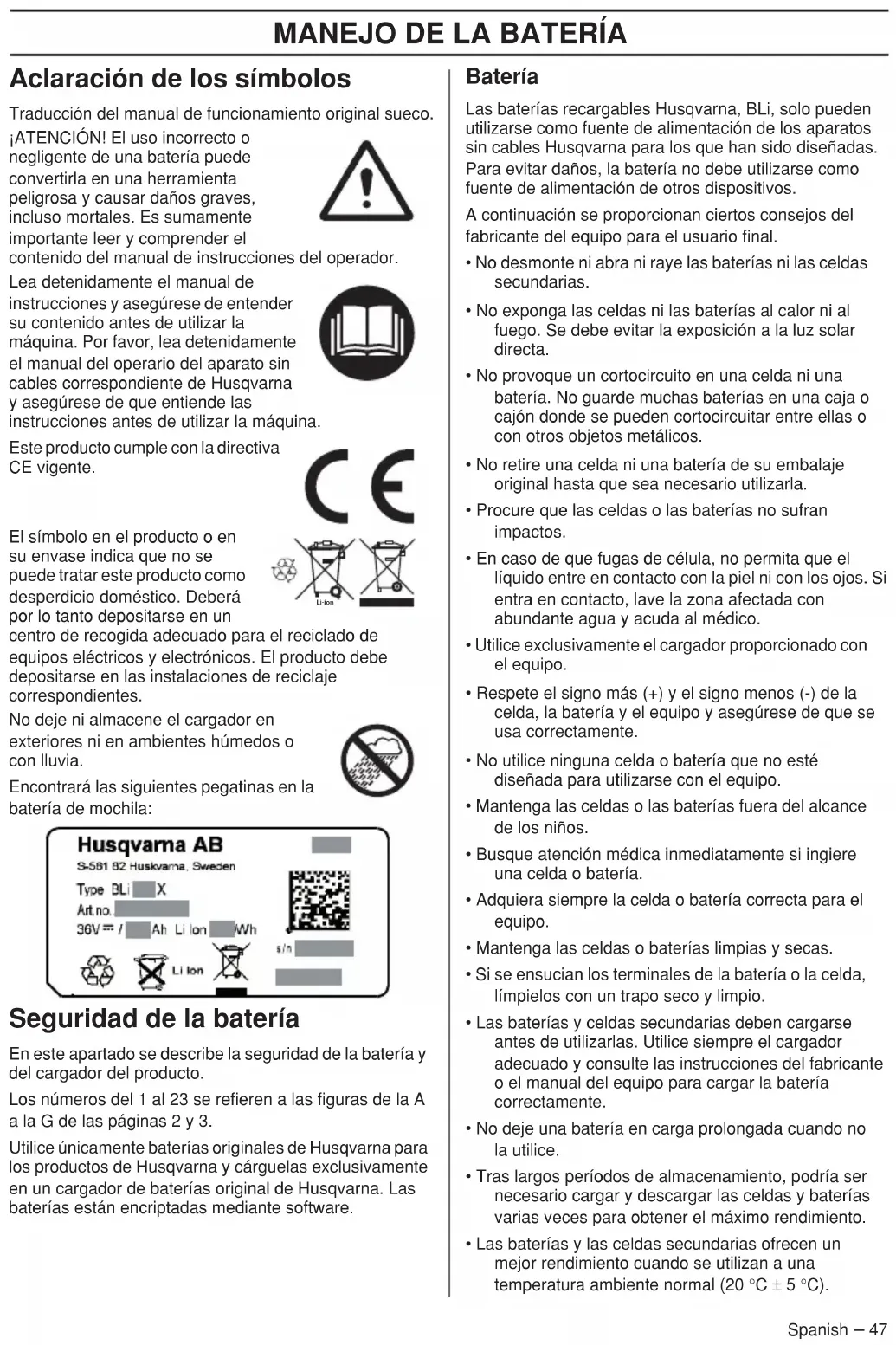 Spanish – 47 Aclaración de los símbolos Traducción del manual de funcionamiento original sueco. ¡ATENCIÓN! El uso incorrecto o negligente de una batería puede convertirla en una herramienta peligrosa y causar daños graves, incluso mortales. Es sumamente importante leer y comprender el contenido del manual de instrucciones del operador. Lea detenidamente el manual de instrucciones y asegúrese de entender su contenido antes de utilizar la máquina. Por favor, lea detenidamente el manual del operario del aparato sin cables correspondiente de Husqvarna y asegúrese de que entiende las instrucciones antes de utilizar la máquina. Este producto cumple con la directiva CE vigente. El símbolo en el producto o en su envase indica que no se puede tratar este producto como desperdicio doméstico. Deberá por lo tanto depositarse en un centro de recogida adecuado para el reciclado de equipos eléctricos y electrónicos. El producto debe depositarse en las instalaciones de reciclaje correspondientes. No deje ni almacene el cargador en exteriores ni en ambientes húmedos o con lluvia. Encontrará las siguientes pegatinas en la batería de mochila: Seguridad de la batería En este apartado se describe la seguridad de la batería y del cargador del producto. Los números del 1 al 23 se refieren a las figuras de la A a la G de las páginas 2 y 3. Utilice únicamente baterías originales de Husqvarna para los productos de Husqvarna y cárguelas exclusivamente en un cargador de baterías original de Husqvarna. Las baterías están encriptadas mediante software. Batería Las baterías recargables Husqvarna, BLi, solo pueden utilizarse como fuente de alimentación de los aparatos sin cables Husqvarna para los que han sido diseñadas. Para evitar daños, la batería no debe utilizarse como fuente de alimentación de otros dispositivos. A continuación se proporcionan ciertos consejos del fabricante del equipo para el usuario final.