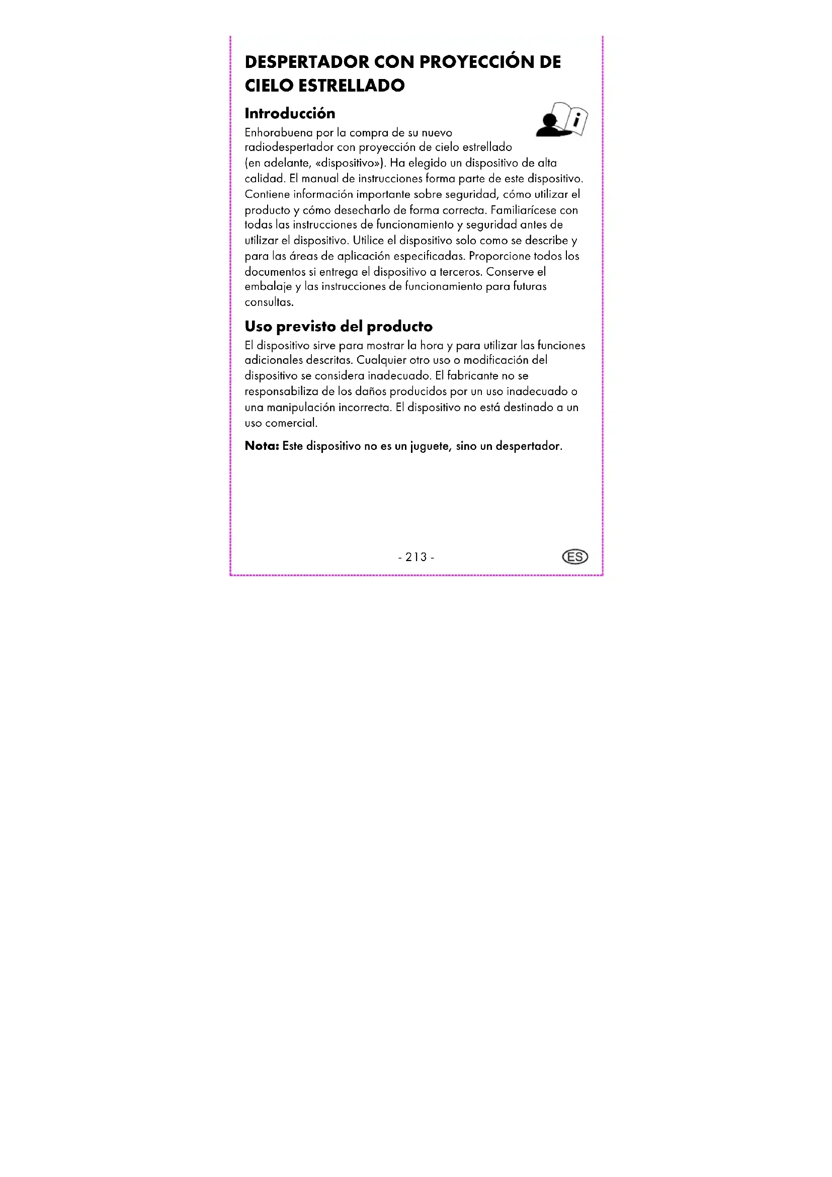 CIELO ESTRELLADO Introducción Enhorabuena por la compra de su nuevo radiodespertador con proyección de cielo estrellado (en adelante, «dispositivo»). Ha elegido un dispositivo de alta calidad. El manual de instrucciones forma parte de este dispositivo. Contiene información importante sobre seguridad, cómo utilizar el producto y cómo desecharlo de forma correcta. Familiarícese con todas las instrucciones de funcionamiento y seguridad antes de utilizar el dispositivo. Utilice el dispositivo solo como se describe y para las áreas de aplicación especificadas. Proporcione todos los documentos si entrega el dispositivo a terceros. Conserve el embalaje y las instrucciones de funcionamiento para futuras consultas. Uso previsto del producto El dispositivo sirve para mostrar la hora y para utilizar las funciones adicionales descritas. Cualquier otro uso o modificación del dispositivo se considera inadecuado. El fabricante no se responsabiliza de los daños producidos por un uso inadecuado o una manipulación incorrecta. El dispositivo no está destinado a un uso comercial. Nota: Este dispositivo no es un juguete, sino un despertador.- 214 - Contenido Nota: Compruebe el contenido de la entrega después de la compra. Asegúrese de que estén todas las piezas y de que estas no tengan defectos. Si la entrega está incompleta o hay piezas dañadas, no utilice el dispositivo. Póngase en contacto con el servicio de asistencia técnica (véase «Tramitación de la garantía»).