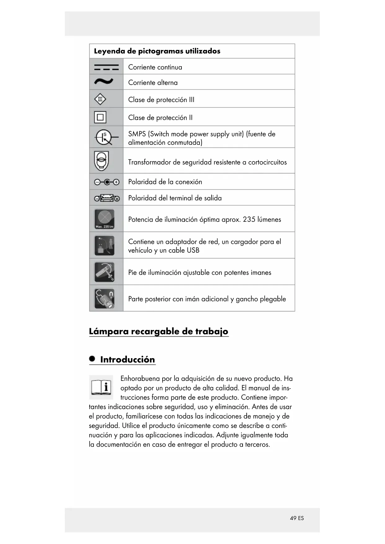 Cable USB Características técnicas Lámpara de trabajo inalámbrica: Bombillas LED: 8 bombillas LED para la luz lateral y 1 bombilla LED para el foco (no intercam- biable); cada una de 0,5 W Batería: batería de iones de litio, 3,7 V, 1000 mAh (no reemplazable) Tiempo de carga: 3 a 5 horas Tiempo de iluminación (con baterías completamente cargadas): Lámpara lateral a máxima potencia: aprox. 1,8 horas Lámpara lateral a potencia mínima: aprox. 2,1 horas Foco: aprox. 13,5 horas Vida útil de los LED: aprox. 20.000 horas Clase de protección: III / Tipo de protección: IP20 Polaridad de la conexión: Adaptador de red: Entrada: 100–240 V∼, 50 / 60 Hz Salida: 5 V , 500 mA N.º de modelo: SD-G0500500USB Clase de protección: II /51 ES Tipo de protección: IP20 Certificado por las organizaciones Intertek/GS Adaptador para el vehículo: Entrada: 12 V Salida: 5 V , 500 mA Tipo de protección: IP20 Dispositivo de seguridad reemplazable: F2AL, 250 V∼, Ø 5 x 20 (L) mm Contenido 1 lámpara de trabajo inalámbrica 1 adaptador de red 1 adaptador de vehículo para conexión 12 V 1 cable USB 1 manual de instrucciones Aviso sobre seguridad ¡Familiarícese con todas las instrucciones de uso y seguridad antes de utilizar este producto! Si entrega este producto a terceros, ¡no olvide adjuntar igualmente toda la documentación!