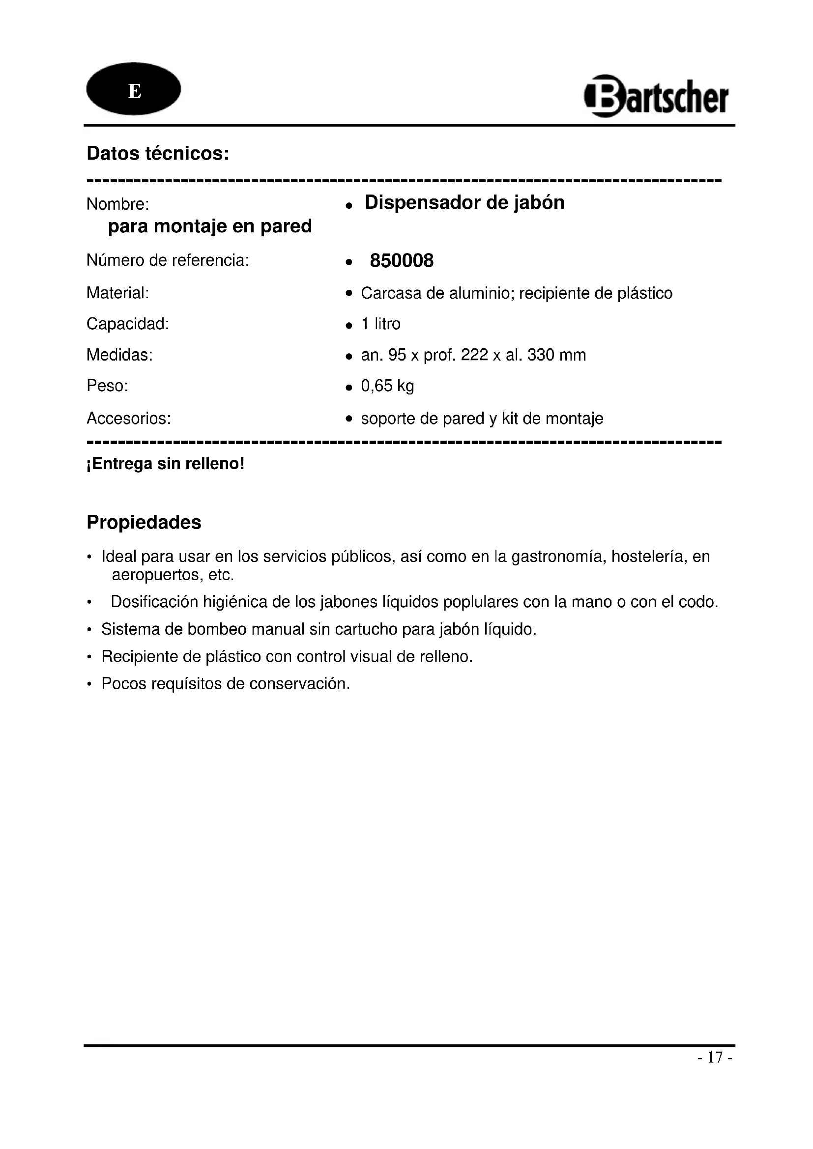 850008 - Dispensador de jabón BARTSCHER - Manual de uso y guía de instrucciones gratis