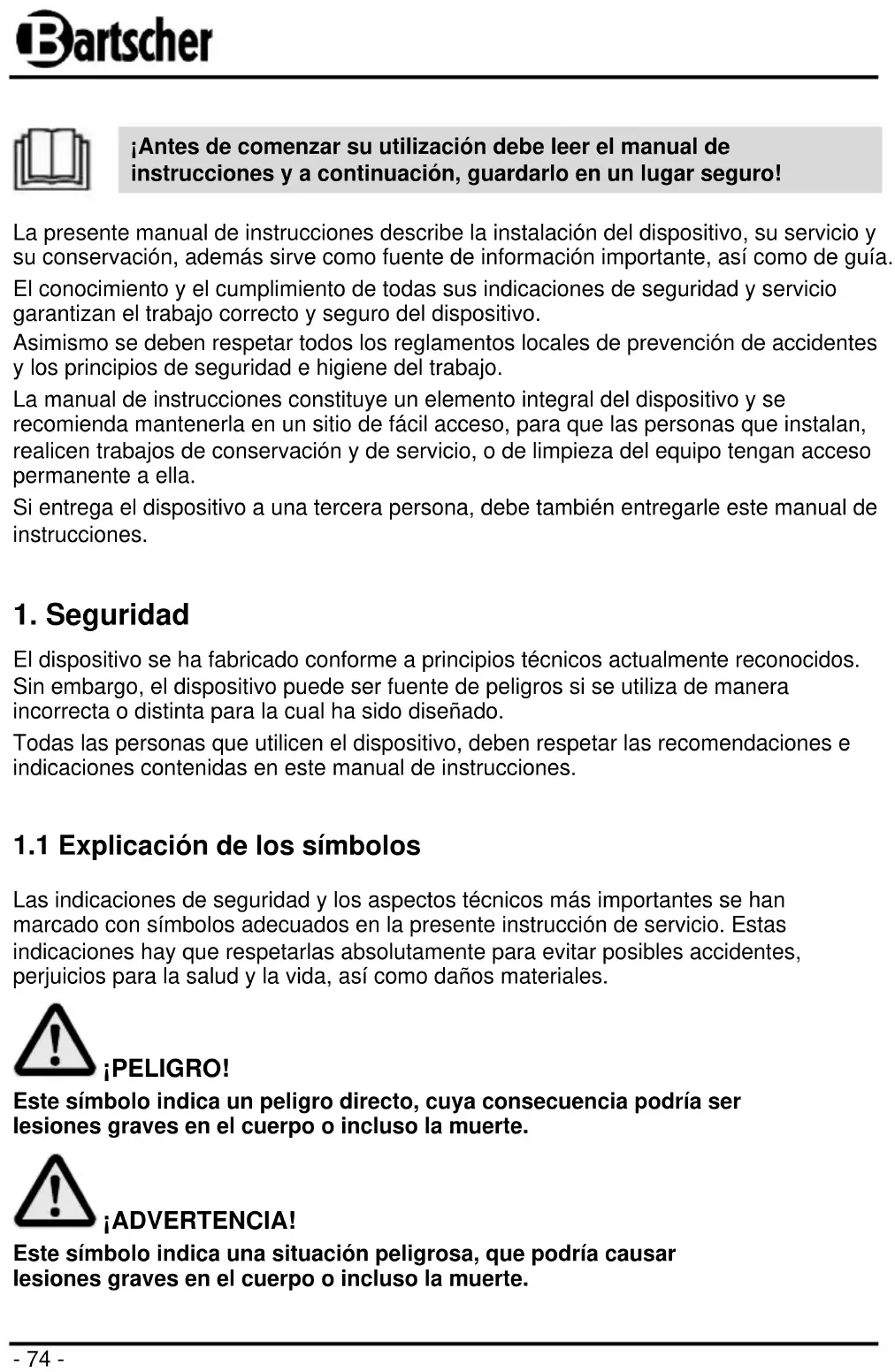 La presente manual de instrucciones describe la instalacion del dispositivo, su serviceo y su conservacion, ademas sirve como fuente de informacion importante, asi como de guia.