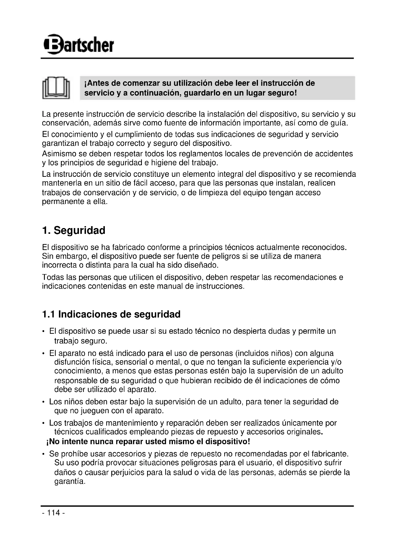 ¡Antes de comenzar su utilización debe leer el instrucción de servicio y a continuación, guardarlo en un lugar seguro! La presente instrucción de servicio describe la instalación del dispositivo, su servicio y su conservación, además sirve como fuente de información importante, así como de guía. El conocimiento y el cumplimiento de todas sus indicaciones de seguridad y servicio garantizan el trabajo correcto y seguro del dispositivo. Asimismo se deben respetar todos los reglamentos locales de prevención de accidentes y los principios de seguridad e higiene del trabajo. La instrucción de servicio constituye un elemento integral del dispositivo y se recomienda mantenerla en un sitio de fácil acceso, para que las personas que instalan, realicen trabajos de conservación y de servicio, o de limpieza del equipo tengan acceso permanente a ella.
