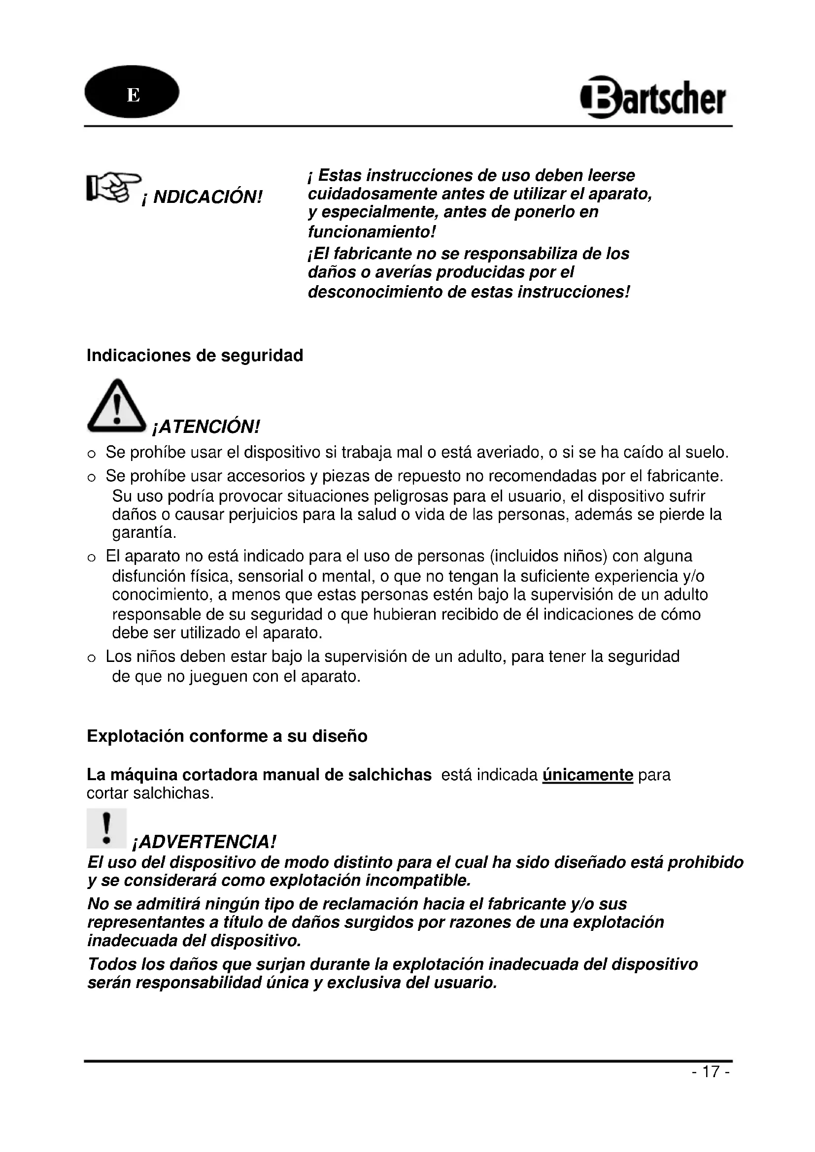 Bartscher GmbH Franz-Kleine-Str. 28 D-33154 Salzkotten Tel.: +49 (0) 5258 971-0 Germania Fax: +49 (0) 5258 971-120- 17 - ¡ NDICACIÓN! ¡ Estas instrucciones de uso deben leerse cuidadosamente antes de utilizar el aparato, y especialmente, antes de ponerlo en funcionamiento! ¡El fabricante no se responsabiliza de los daños o averías producidas por el desconocimiento de estas instrucciones!