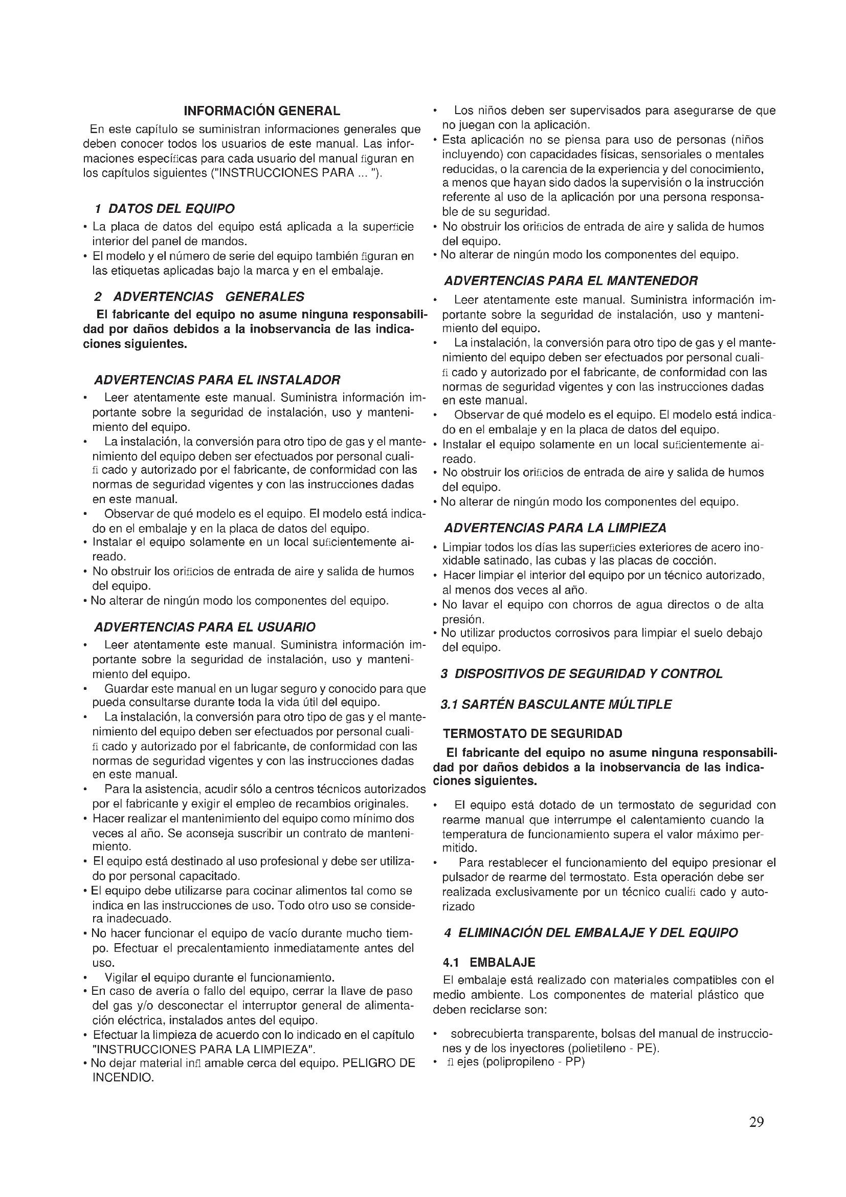 - El modelo y el número de serie del equipo también fi guran en las etiquetas aplicadas bajo la marca y en el embalaje. 2 ADVERTENCIAS GENERALES El fabricante del equipo no asume ninguna responsabili- dad por daños debidos a la inobservancia de las indica- ciones siguientes.