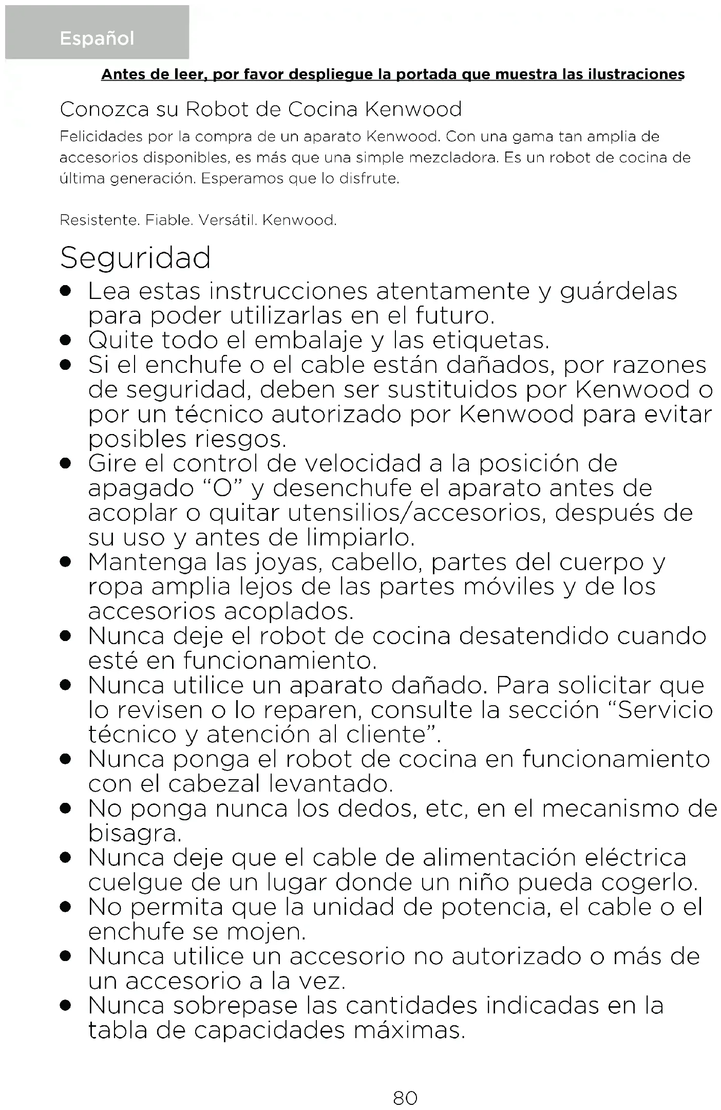 Nunca sobrepase las cantidades indicadas en la tabla de capacidades máximas. Español Antes de leer, por favor despliegue la portada que muestra las ilustraciones 80O Al usar un accesorio, lea y siga las instrucciones de seguridad que se facilitan con el mismo.