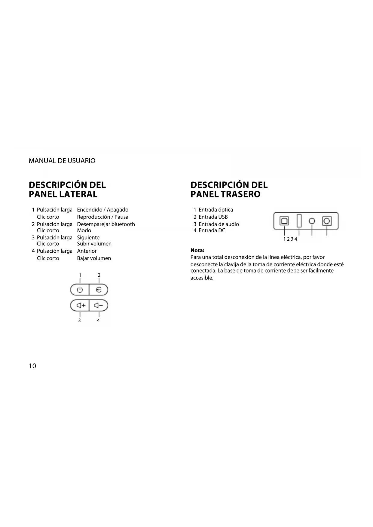 Pulsación larga Clic corto Pulsación larga Clic corto Pulsación larga Clic corto Pulsación larga Clic corto Encendido / Apagado Reproducción / Pausa Desemparejar bluetooth Modo Siguiente Subir volumen Anterior Bajar volumen Entrada óptica Entrada USB Entrada de audio Entrada DC
