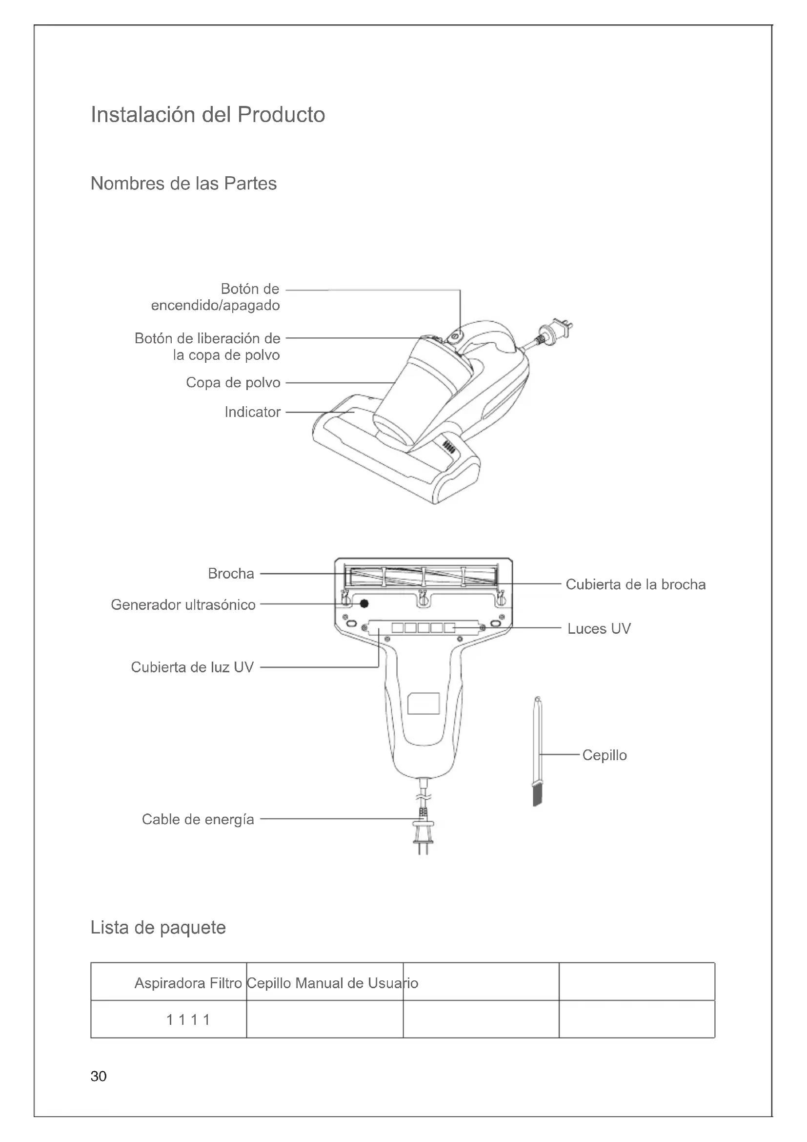 Cubierta de luz UV Nota: para la seguridad, asegurar se de apagar la máquina y desconectar el cable de alimentación antes de limpiar la luz ultravioleta en caso de descarga eléctrica. Mantenimiento y almacenamiento diario Limpiar la copa para polvo y el ltro después de cada uso para un uso posterior. Si la copa de polvo se llena de polvo durante el uso, se recomienda limpiarla de inmediato, de lo contrario afectará el efecto de uso; Después de que el tiempo de uso acumulado del algodón del ltro alcance las 30-50 horas (según el uso del algodón del ltro), se recomienda comprar y reemplazar el algodón del ltro en el lugar designado, para no afectar el rendimiento de toda la máquina. Cualquier papel, vidrio de plomo, plástico afectará en gran medida el efecto de la luz UV. Limpie y limpie el tubo de luz UV regularmente para un mejor uso. No toque el tubo de luz UV ya que la suciedad afectará el efecto de la luz UV.33 Precauciones Lea este manual de instrucciones detenidamente antes de usarlo y guárdelo adecuadamente para uso futuro. Nunca deje la máquina funcionando sin supervisión. Apague el interruptor de alimentación y desconecte el cable de alimentación si la máquina va a estar inactiva. No desenchufe el cable de alimentación con la mano húmeda en caso de descarga eléctrica. Corte la fuente de energía en mantenimiento o fuera de servicio. Mantenga el cable de alimentación alejado de objetos afilados y no arrastre el cable para mover la máquina en caso de daños en el cable. Por razones de seguridad, no use el producto para limpiar objetos calientes como carbón, colillas de cigarrillos, objetos afilados como vidrios rotos, líquidos corrosivos, materiales inflamables y explosivos como gasolina y alcohol. De lo contrario, puede causar daños al producto o incendios. No use este producto para limpiar agua o polvo húmedo. No lo opere en lugares húmedos (como baños, inodoros, lavaderos, etc.) para evitar un mal funcionamiento. No coloque la máquina cerca de aparatos de calefacción ni la exponga a la luz solar directa en caso de peligro de incendio. Mantenga este producto fuera del alcance de personas especiales como niños sin supervisión de un adulto. No opere esta máquina con el puerto de succión bloqueado en caso de daños al producto El producto tiene luz ultravioleta, por razones de seguridad. No mire la parte inferior de la máquina cuando esté encendida en caso de que los rayos ultravioleta dañen. No aplique este producto a las plantas. El uso excesivo de UV puede causar daños a los objetos. No se siente sobre este producto en caso de lesiones personales y daños al producto. No retire la cubierta del cepillo giratorio ni la fuerce hacia afuera cuando la máquina esté encendida por razones de seguridad. Este producto solo puede usarse para limpiar textiles como colchones, mantas, almohadas, sofás, etc. Si el cable de alimentación está dañado, solicite ayuda profesional del fabricante y otros profesionales por razones de seguridad..34 Solución de problemas Si la falla persiste después de adoptar las siguientes soluciones, comuníquese inmediatamente con el servicio postventa o con el distribuidor local. Problemas Causas posibles Soliciones La máquina no funciona El cable de alimentación no está rmemente insertado. Inserte el cable de alimentación rmemente. No hay corriente en el zócalo. Verique el zócalo. Interruptor de encendido no presio- nado. Presione el botón de encendido / apagado. Baja potencia de succión Puerto de succión obstruido. Limpiar el puerto de succión. Acumulación de polvo en el ltro. Limpia el ltro. Acumulación de polvo en el ciclón. Limpiar ciclón Acumulación de polvo en el ltro. Limpiar el ltro. La lámpara UV no funciona La función UV se desactiva automáticamente por razones de seguridad o reejo débil del objeto. La función UV funciona a menos de 5 cm de altura del objeto. La máquina funciona en la misma posición durante mucho tiempo. Mueva la máquina hacia adelante y hacia atrás La máquina se coloca en posición vertical. Máquina inclinada no más de 30 grado La ventana del sensor está con- taminada. Limpiar la ventana del sensor con un paño medio seco. Daño por luz ultravioleta. Póngase en contacto con el servi- cio postventa. Apagado au- tomático Copa de polvo llena La máquina se apagará automáti- camente para evitar que el motor funcione durante mucho tiempo. Si la máquina se apaga automáti- camente, limpie el depósito de polvo y el ltro, desenchufe el cable de alimentación y vuelva a usarlo después de 2 horas. Puerto de succión obstruido. Filtro bloqueado35 Luz UV Motor principal Motor de brocha Placa de suministro de energía Placa Principal Placa de encendido y apagado Placa de infrarrojo izquierdo Generador ultrasónico