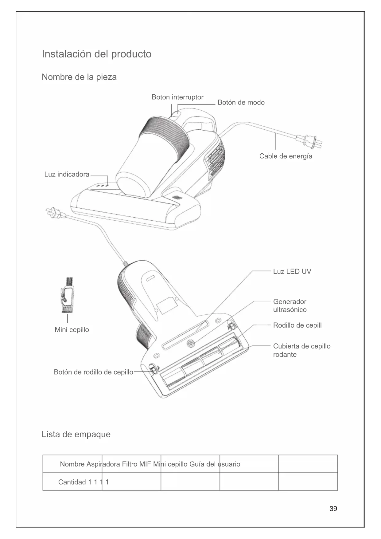 Cepillo pequeño Conjunto de tapa giratoria para el depósito de polvo Ensamblaje de la cubierta de la taza para el polvo Cinta con logo Filtro de metal42 Mantenimiento y almacenamiento diario Se recomienda limpiar la taza de polvo y el ltro de algodón MIF después de cada uso para el siguiente uso. Si la taza de polvo está llena de polvo durante el uso, se recomienda limpiarla inmediatamente, de lo contrario afectará el efecto de uso; Después de que el tiempo de uso acumulado del filtro MIF alcance las 30h-50h (según el uso del filtro MIF), se recomienda comprar y reemplazar el MIF en el lugar designado Filtro, para no afectar el rendimiento de la máquina. La penetración de los rayos ultravioleta es débil y cualquier papel, vidrio ordinario o plástico reducirá en gran medida la intensidad de la radiación ultravioleta. Además, las manchas de polvo y aceite en la cubierta transparente inferior afectarán directamente su capacidad de penetración, por lo que la cubierta transparente debe limpiarse y limpiarse con regularidad para evitar afectar la penetración y la fuerza de los rayos ultravioleta. No toque la cubierta transparente con los dedos, porque las manchas afectarán la penetración de los rayos ultravioleta. Cuando no utilice la máquina durante mucho tiempo, colóquela en un lugar fresco y seco, y no la exponga a la luz solar directa ni a un ambiente húmedo.43 Precauciones 1.Lea este manual de instrucciones detenidamente antes de usarlo y guárdelo adecuadamente para uso futuro. 2.Nunca deje la máquina funcionando sin supervisión. 3.Apague el interruptor de alimentación y desconecte el cable de alimentación si la máquina va a estar inactiva. No desenchufe el cable de alimentación con la mano húmeda en caso de descarga eléctrica. 4.Corte la fuente de energía en mantenimiento o fuera de servicio. 5.Mantenga el cable de alimentación alejado de objetos afilados y no arrastre el cable para mover la máquina en caso de daños en el cable. 6.Por razones de seguridad, no use el producto para limpiar objetos calientes como carbón, colillas de cigarrillos, objetos afilados como vidrios rotos, líquidos corrosivos, materiales inflamables y explosivos como gasolina y alcohol. De lo contrario, puede causar daños al producto o incendios. 7.No use este producto para limpiar agua o polvo húmedo. No lo opere en lugares húmedos (como baños, inodoros, lavaderos, etc.) para evitar un mal funcionamiento. 8.No coloque la máquina cerca de aparatos de calefacción ni la exponga a la luz solar directa en caso de peligro de incendio. 9.Mantenga este producto fuera del alcance de personas especiales como niños sin supervisión de un adulto. 10.No opere esta máquina con el puerto de succión bloqueado en caso de daños al producto. 11.El producto tiene luz ultravioleta, por razones de seguridad. No mire la parte inferior de la máquina cuando esté encendida en caso de que los rayos ultravioleta dañen. 12.No aplique este producto a las plantas. El uso excesivo de UV puede causar daños a los objetos. 13.No se siente sobre este producto en caso de lesiones personales y daños al producto. 14.No retire la cubierta del cepillo giratorio ni la fuerce hacia afuera cuando la máquina esté encendida por razones de seguridad. 15.Este producto solo puede usarse para limpiar textiles como colchones, mantas, almohadas, sofás, etc. 16.Si el cable de alimentación está dañado, solicite ayuda profesional del fabricante y otros profesionales por razones de seguridad. Solución de problemas Si la falla persiste después de adoptar las siguientes soluciones, comuníquese inmediatamente con el servicio postventa o con el distribuidor local. Problemas Causas posibles Soliciones La máquina no funciona El cable de alimentación no está rmemente insertado Inserte el cable de alimentación rmemente No hay corriente en el zócalo Verique el zócalo Interruptor de encendido no presionado Presione el botón de encendido / apagado44 Problemas Causas posibles Soliciones Baja potencia de succión Puerto de succión obstruido Limpiar el puerto de succión Acumulación de polvo en el ltro Limpia el ltro Acumulación de polvo en el ciclón Limpiar ciclón La lámpara UV no funciona La función UV se desactiva automáticamente por razones de seguridad o reejo débil del objeto La función UV funciona a menos de 3 cm de altura del objeto La máquina funciona en la misma posición durante mucho tiempo Mueva la máquina hacia adelante y hacia atrás La máquina se coloca en posición vertical Máquina inclinada no más de 30 grado La ventana del sensor está contaminada Limpiar la ventana del sensor con un paño medio seco Daño por luz ultravioleta Póngase en contacto con el servicio postventa Apagado automático Copa de polvo llena La máquina se apagará automáticamente para evitar que el motor funcione durante mucho tiempo. Si la máquina se apaga automáticamente, l impie el depósito de polvo y el ltro, desenchufe el cable de alimentación y vuelva a usarlo después de 2 horas Puerto de succión obstruido Filtro bloqueado El cepillo giratorio dejó de funcionar de repente Brushroll enredado con materia extraña Retire la cubierta y limpie el brocha de acuerdo con la guía del usuario El cinturón está desprendido o roto Retire la cubierta de acuerdo con la guía del usuario y revise la correa. Si está roto, póngase en contacto con el servicio postventa para repararlo Nota: Si hay un problema después de adoptar las siguientes soluciones, comuníquese inmediatamente con el servicio posventa o el distribuidor local.45 Especicaciones del producto Parámetro técnico Modelo BX6 Voltaje nominal 220V-240V ~ Frecuencia nominal 50Hz Potencia nominal 600W Diagrama de circuito 220V-240V ~50Hz Motor de desempolvado