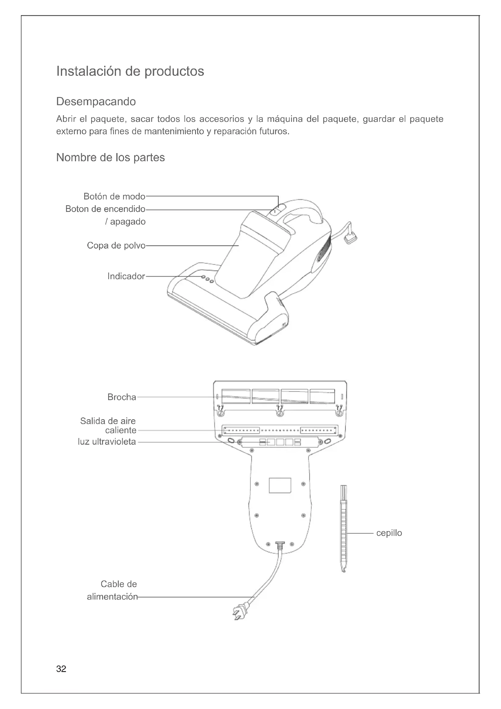 Tocando hacia abajo 7-2 8 Cinturón Cabeza de cepillo hexagonal Cabezal de cepillo de cuatro esquinas 6 7-1 Engranaje hexagonal35 desconecte el cable de alimentación antes de limpiar el cepillo giratorio. Limpieza y Mantenimiento de luz UV Apague la máquina y desconecte el cable de alimentación, limpie la luz UV con ropa seca. Nota: Apague la máquina y desconecte el cable de alimentación antes de limpiar la luz UV en caso de descarga eléctrica. Mantenimiento y almacenaje diariamente