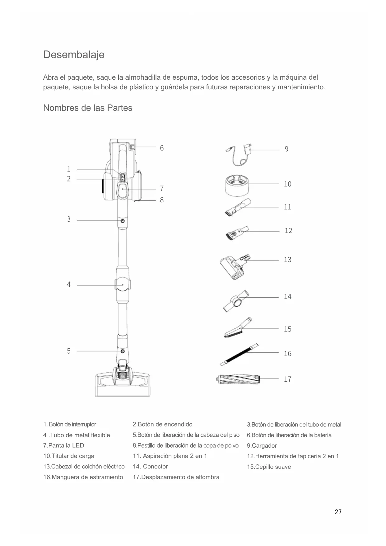 17.Desplazamiento de alfombra 3.Botón de liberación del tubo de metal 6.Botón de liberación de la batería 9.Cargador 12.Herramienta de tapicería 2 en 1 15.Cepillo suave